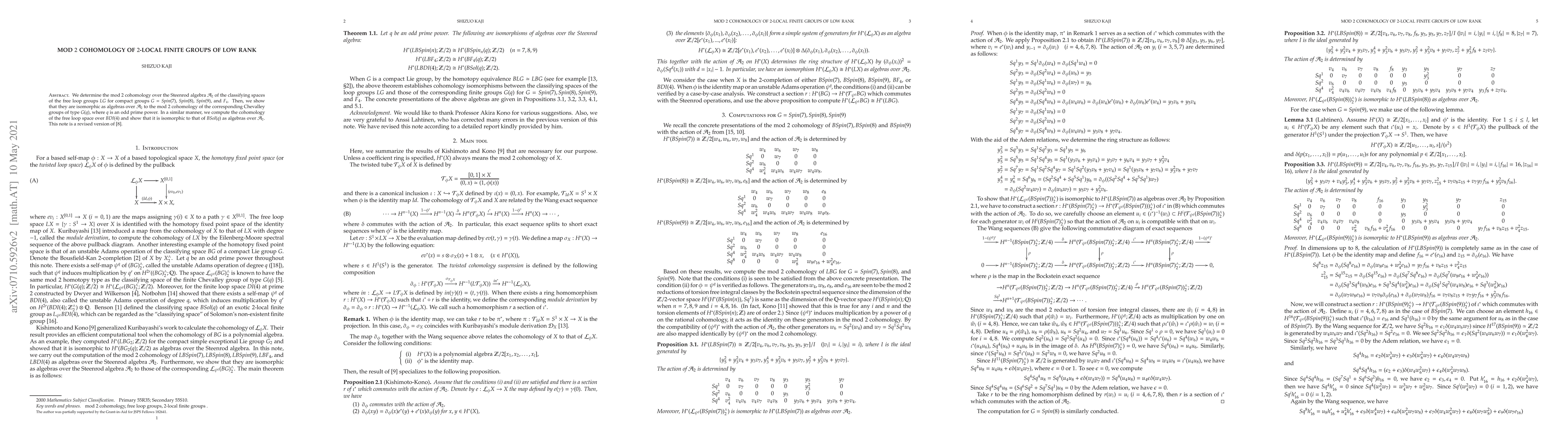This paper determines the mod 2 cohomology of classifying spaces of free loop groups for specific compact groups and shows these are isomorphic to the mod 2 cohomology of corresponding Chevalley groups over the Steenrod algebra. It also computes the cohomology of free loop space over $BDI(4)$ and finds it isomorphic to $BSol(q)$ over the Steenrod algebra.