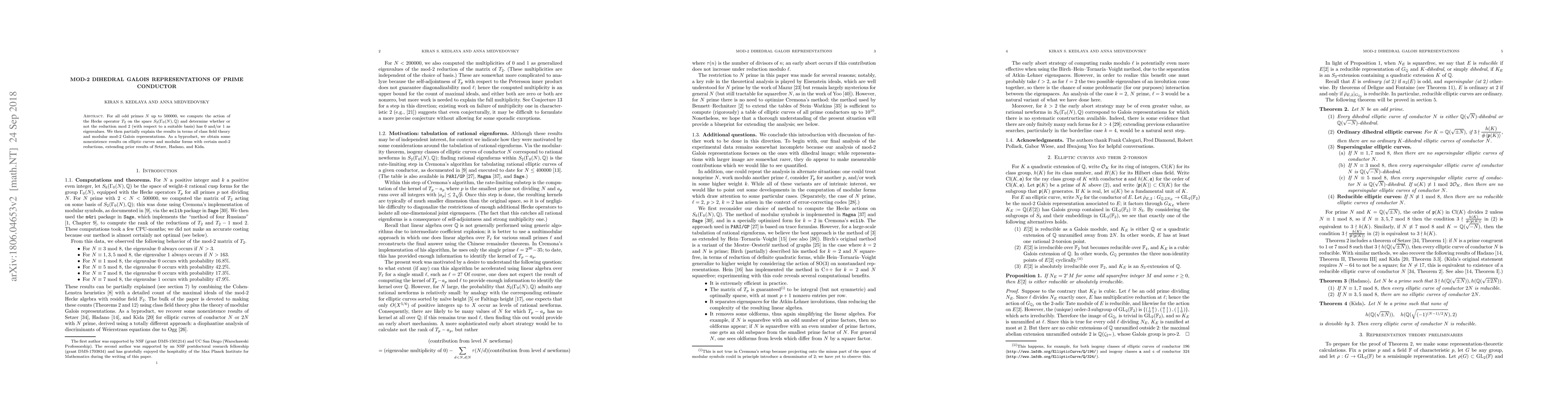 This paper computes the action of the Hecke operator T_2 on the space S_2(Γ_0(N), Q) for odd primes N up to 500,000, determining whether mod-2 reductions have 0 and/or 1 as eigenvalues. It connects these findings to class field theory and modular mod-2 Galois representations, and extends nonexistence results for certain elliptic curves and modular forms.