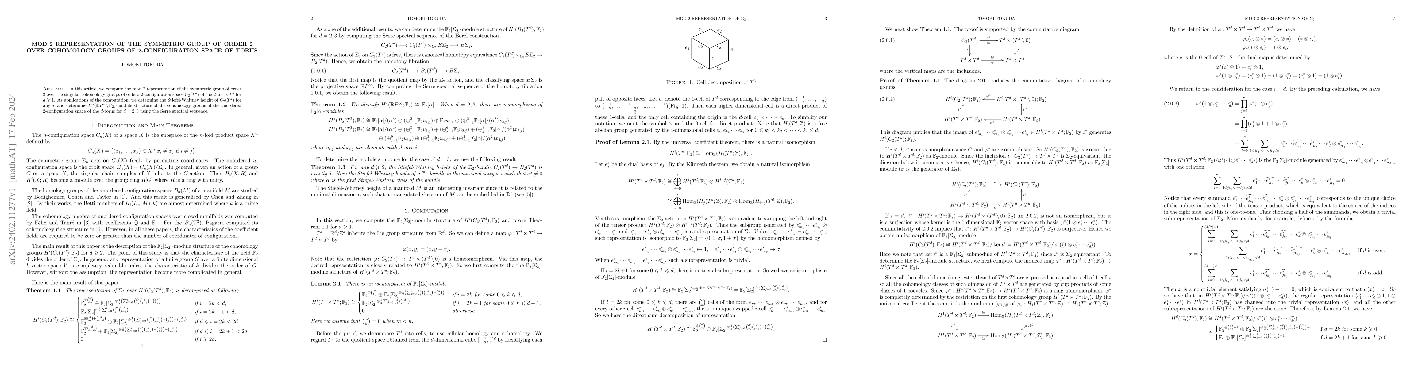 This paper computes the mod 2 representation of the symmetric group of order 2 over the singular cohomology groups of the ordered 2-configuration space of the d-torus. It applies these computations to determine the Stiefel-Whitney height and the $\mathbb{F}_{2}[\Sigma_{2}]$-module structure of the cohomology groups of the unordered 2-configuration space for d=2,3.