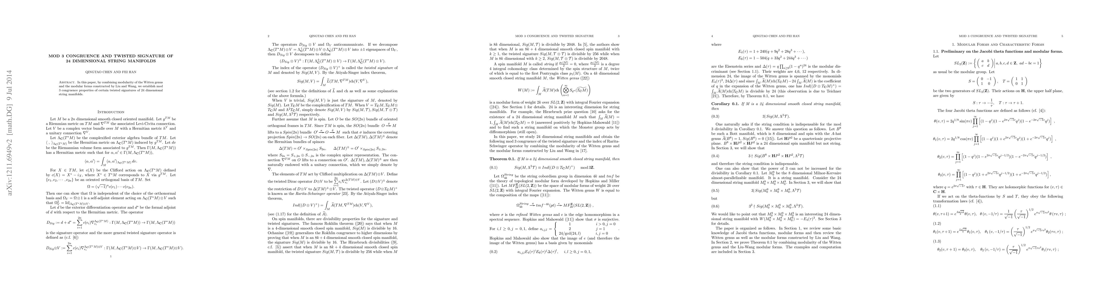 In this paper, by combining modularity of the Witten genus and the modular forms constructed by Liu and Wang, we establish mod 3 congruence properties of certain twisted signatures of 24 dimensional string manifolds.