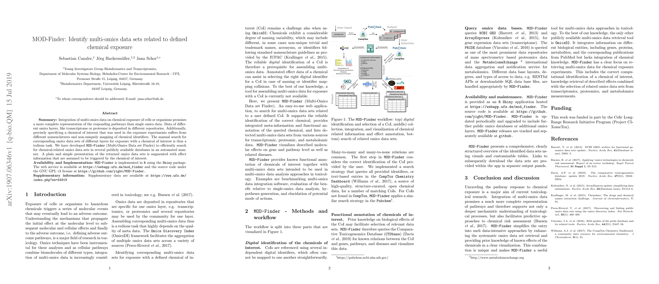 Summary: Integration of multi-omics data on chemical exposure of cells or organisms promises a more complete representation of the responding pathways than single omics data. Data of different omics layers, like transcriptome or proteome is deposited in different repositories. Additionally, precisely specifying a chemical of interest that was used in the exposure experiments suffers from different nomenclatures and non-uniquely mapping of chemical identifiers. The manual search for corresponding omics data sets of different layers for exposure with a chemical of interest is thus a tedious task. We have developed MOD-Finder (Multi-Omics Data set Finder) to efficiently search for chemical-related omics data sets in several publicly available databases in an automated manner. A plain and simple presentation of the returned omics data sets is augmented with effect information that are assumed to be triggered by the chemical of interest. Availability and Implementation: MOD-Finder is implemented in R using the Shiny package. The web service is available at https://webapp.ufz.de/mod_finder and the source code under the GNU GPL v3 license at https://github.com/yigbt/MOD-Finder. Supplementary information: Supplementary data are available at https://www.ufz.de/index.php?en=44919