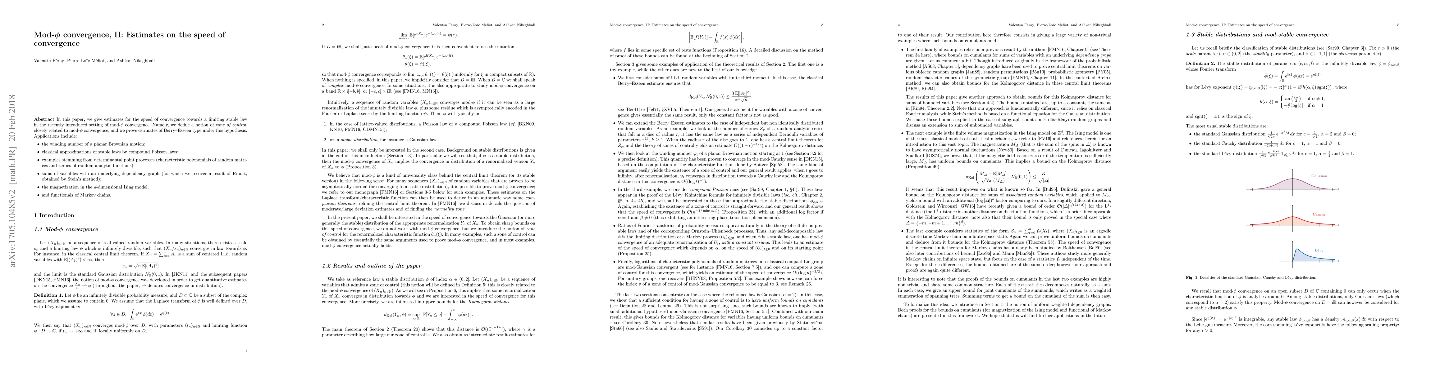 This paper provides estimates for the speed of convergence towards a limiting stable law in mod-$\phi$ convergence, introducing a zone of control and proving Berry-Esseen type estimates. Applications span various fields including Brownian motion, compound Poisson laws, random matrices, and the Ising model.