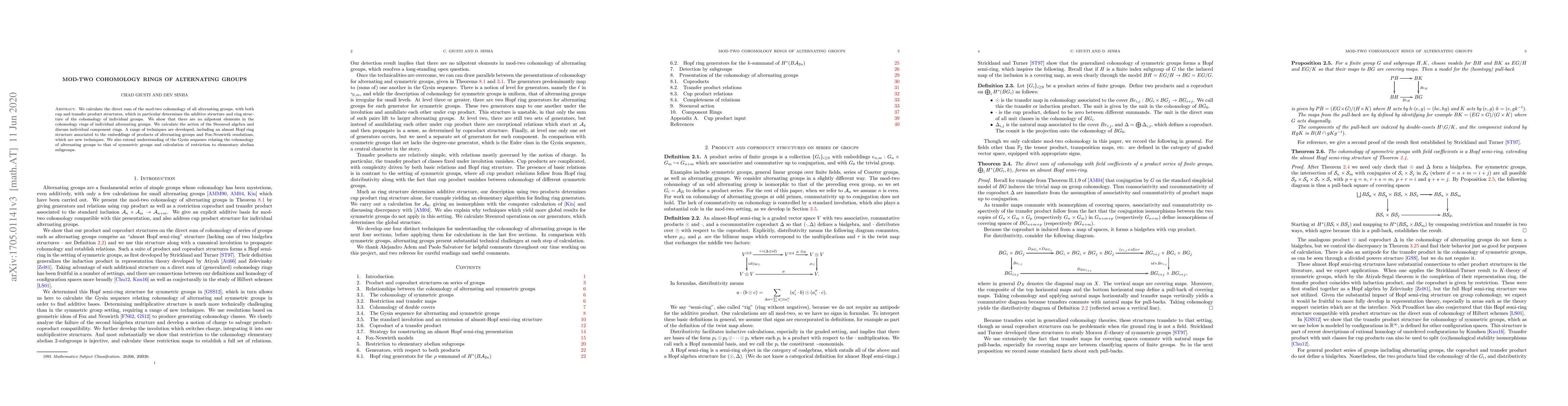 This paper calculates the mod-two cohomology rings of all alternating groups, detailing their cup and transfer product structures, and demonstrates the absence of nilpotent elements. It employs a variety of techniques including an almost Hopf ring structure and the Gysin sequence to achieve these results.