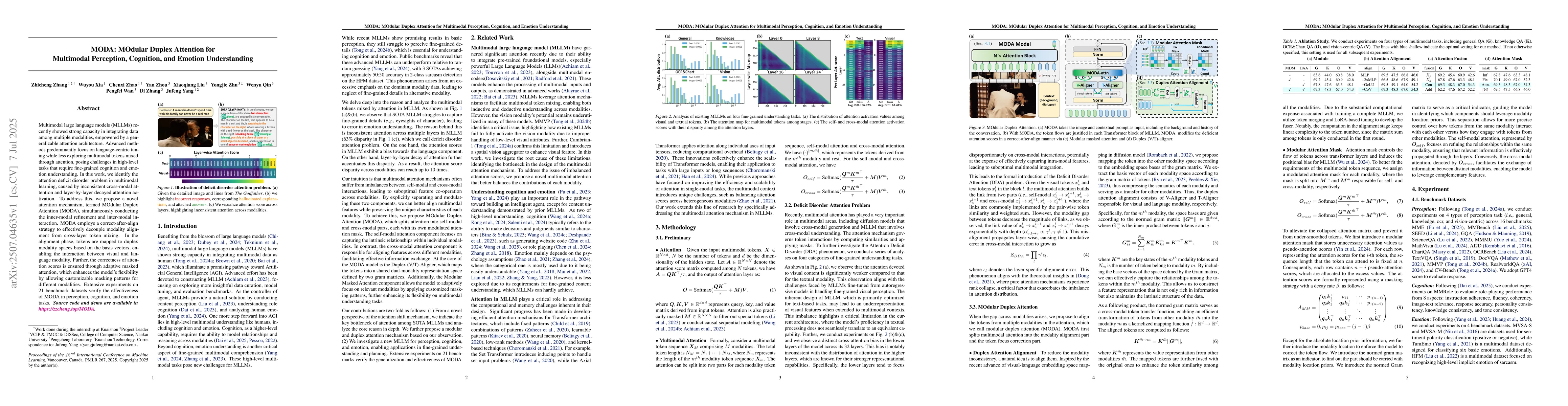 Multimodal large language models (MLLMs) recently showed strong capacity in integrating data among multiple modalities, empowered by a generalizable attention architecture. Advanced methods predominantly focus on language-centric tuning while less exploring multimodal tokens mixed through attention, posing challenges in high-level tasks that require fine-grained cognition and emotion understanding. In this work, we identify the attention deficit disorder problem in multimodal learning, caused by inconsistent cross-modal attention and layer-by-layer decayed attention activation. To address this, we propose a novel attention mechanism, termed MOdular Duplex Attention (MODA), simultaneously conducting the inner-modal refinement and inter-modal interaction. MODA employs a correct-after-align strategy to effectively decouple modality alignment from cross-layer token mixing. In the alignment phase, tokens are mapped to duplex modality spaces based on the basis vectors, enabling the interaction between visual and language modality. Further, the correctness of attention scores is ensured through adaptive masked attention, which enhances the model's flexibility by allowing customizable masking patterns for different modalities. Extensive experiments on 21 benchmark datasets verify the effectiveness of MODA in perception, cognition, and emotion tasks. Source code and demo are available in https://zzcheng.top/MODA.