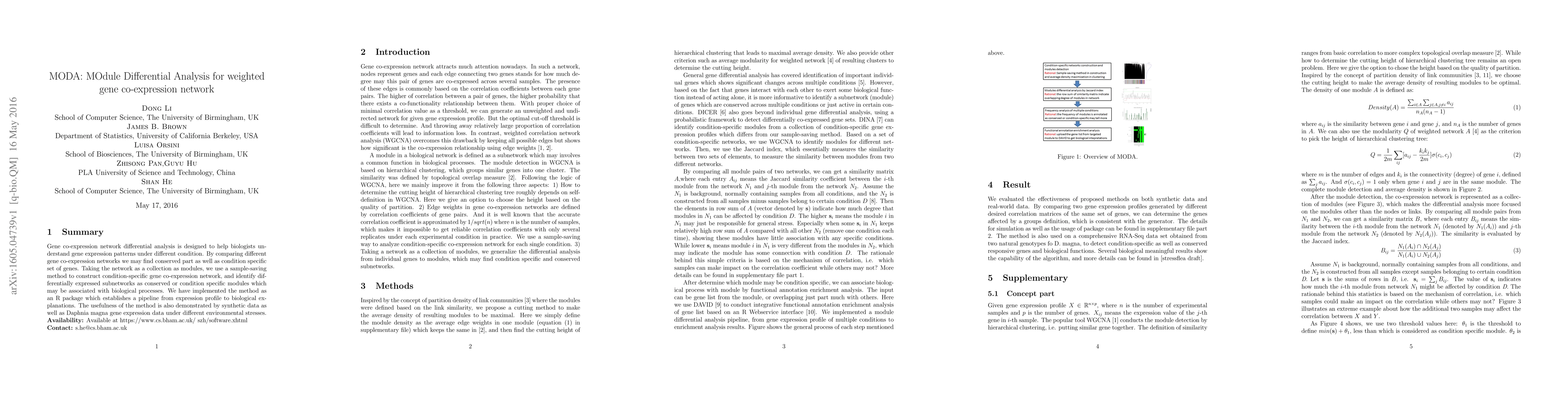 Title: MODA: MOdule Differential Analysis for weighted gene co-expression network Summary: MODA is an R package designed for differential analysis of gene co-expression networks, identifying conserved and condition-specific modules to understand gene expression patterns under different conditions. It demonstrates effectiveness using synthetic and real Daphnia magna data under environmental stress.