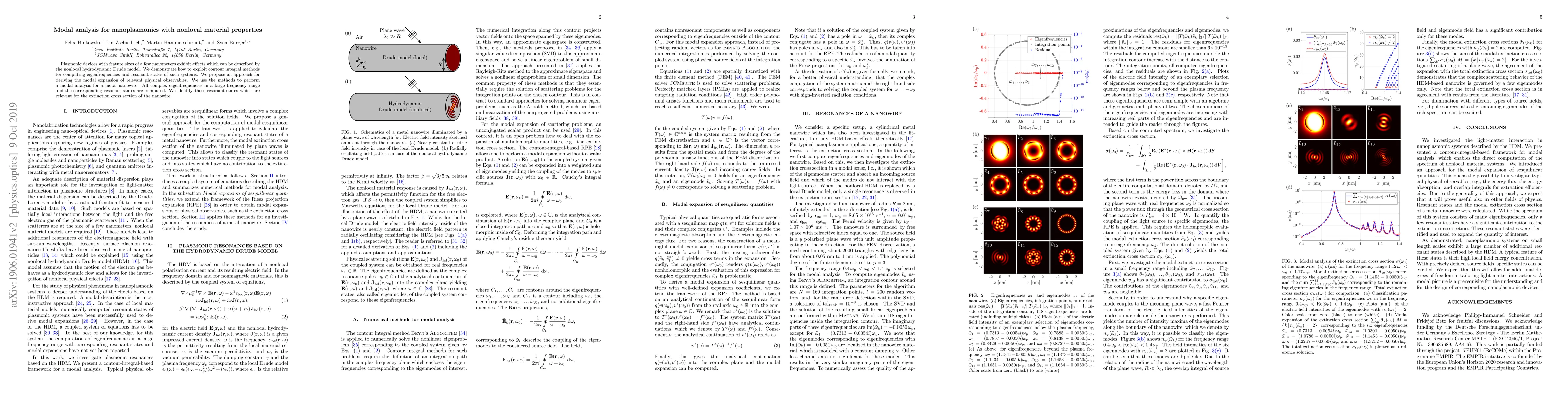 Plasmonic devices with feature sizes of a few nanometers exhibit effects which can be described by the nonlocal hydrodynamic Drude model. We demonstrate how to exploit contour integral methods for computing eigenfrequencies and resonant states of such systems. We propose an approach for deriving the modal expansion of relevant physical observables. We use the methods to perform a modal analysis for a metal nanowire. All complex eigenfrequencies in a large frequency range and the corresponding resonant states are computed. We identify those resonant states which are relevant for the extinction cross section of the nanowire.