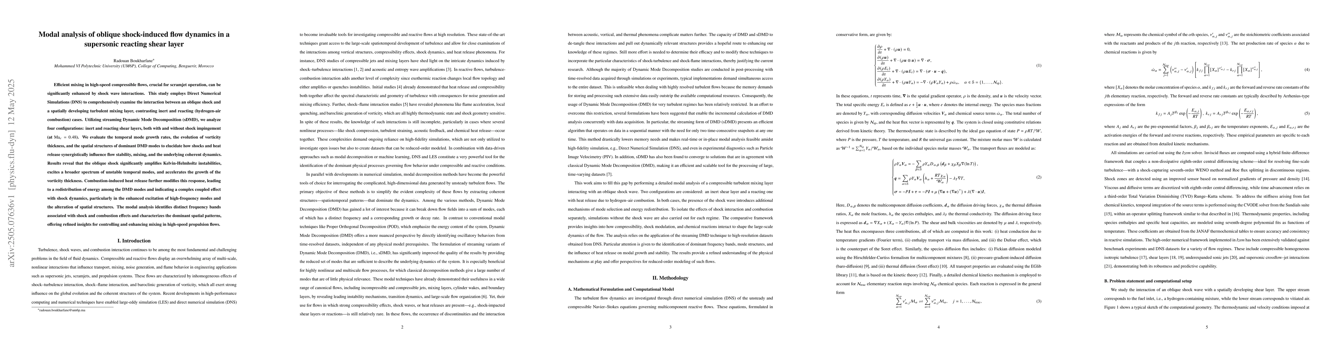 The study uses Direct Numerical Simulations (DNS) to investigate the interaction between an oblique shock and a turbulent mixing layer, comparing inert and reacting (hydrogen-air combustion) cases. Streaming Dynamic Mode Decomposition (sDMD) is employed to analyze four configurations: inert and reacting shear layers, both with and without shock impingement at Ma_c = 0.48.