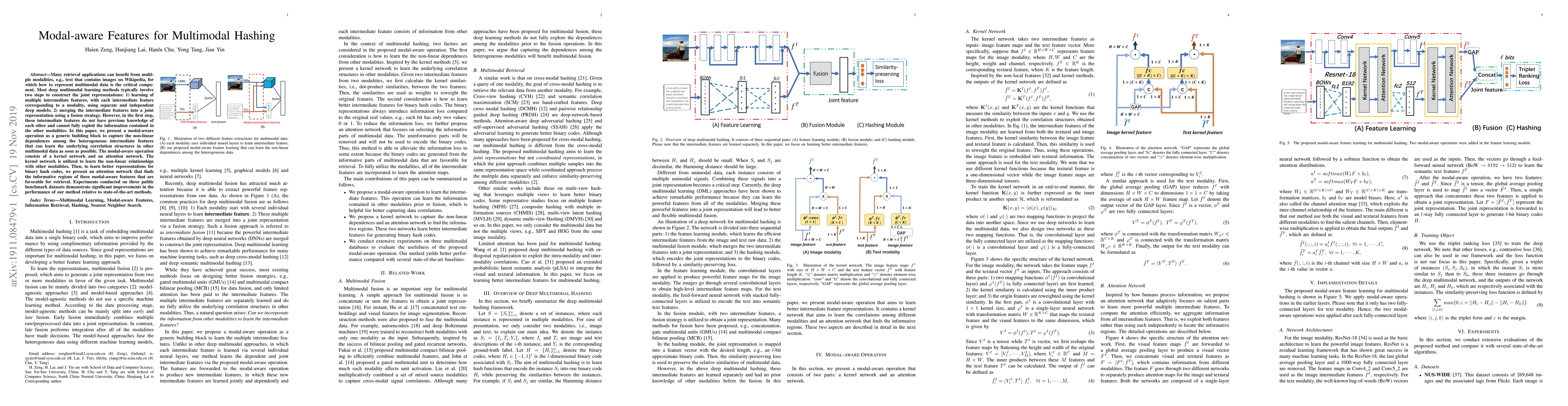 This paper proposes a novel approach to multimodal hashing by introducing a modal-aware operation that captures non-linear relationships between intermediate features learned from separate models. Experiments show significant improvements in performance over state-of-the-art methods.