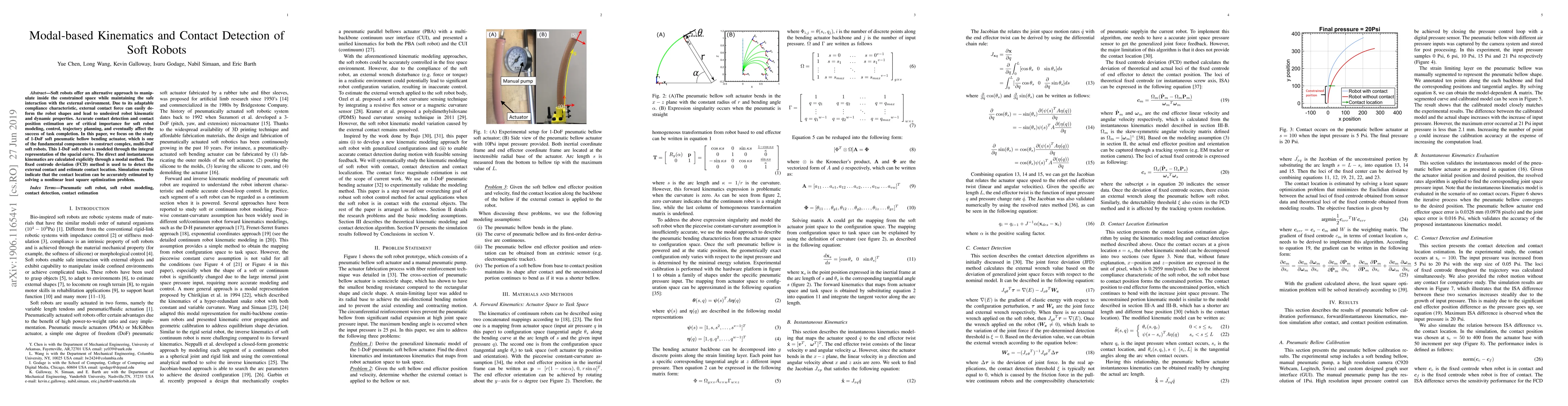 This paper investigates the kinematics and contact detection of a 1-DoF soft pneumatic bellow bending actuator using a modal method for direct kinematics and the fixed centrode deviation method for contact detection. Simulation results show accurate contact location estimation via a nonlinear least square optimization.
