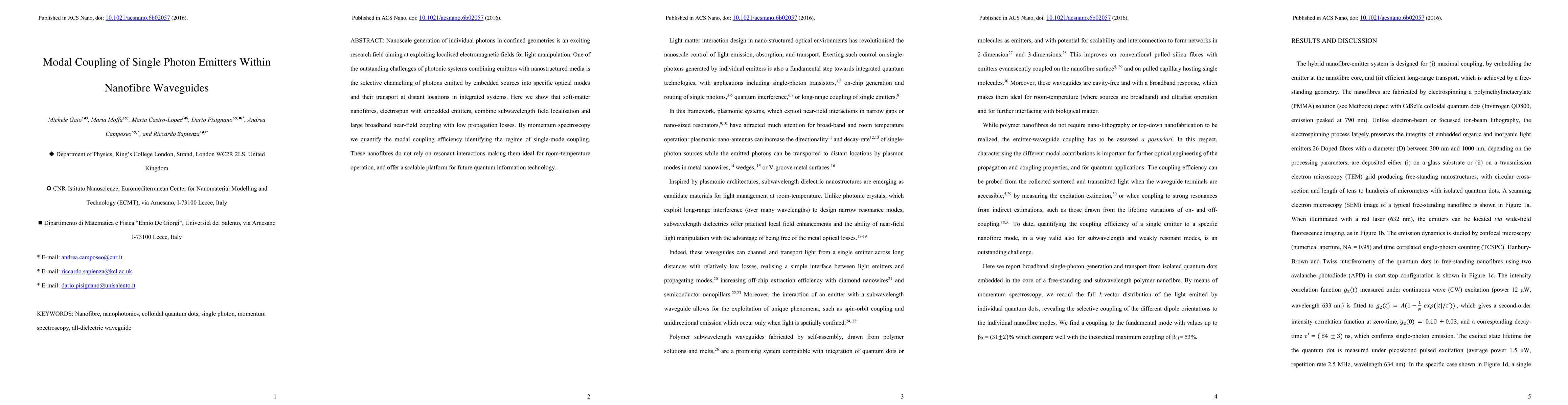 Nanoscale generation of individual photons in confined geometries is an exciting research field aiming at exploiting localized electromagnetic fields for light manipulation. One of the outstanding challenges of photonic systems combining emitters with nanostructured media is the selective channelling of photons emitted by embedded sources into specific optical modes and their transport at distant locations in integrated systems. Here, we show that soft-matter nanofibers, electrospun with embedded emitters, combine subwavelength field localization and large broadband near-field coupling with low propagation losses. By momentum spectroscopy, we quantify the modal coupling efficiency identifying the regime of single-mode coupling. These nanofibers do not rely on resonant interactions, making them ideal for room-temperature operation, and offer a scalable platform for future quantum information technology.