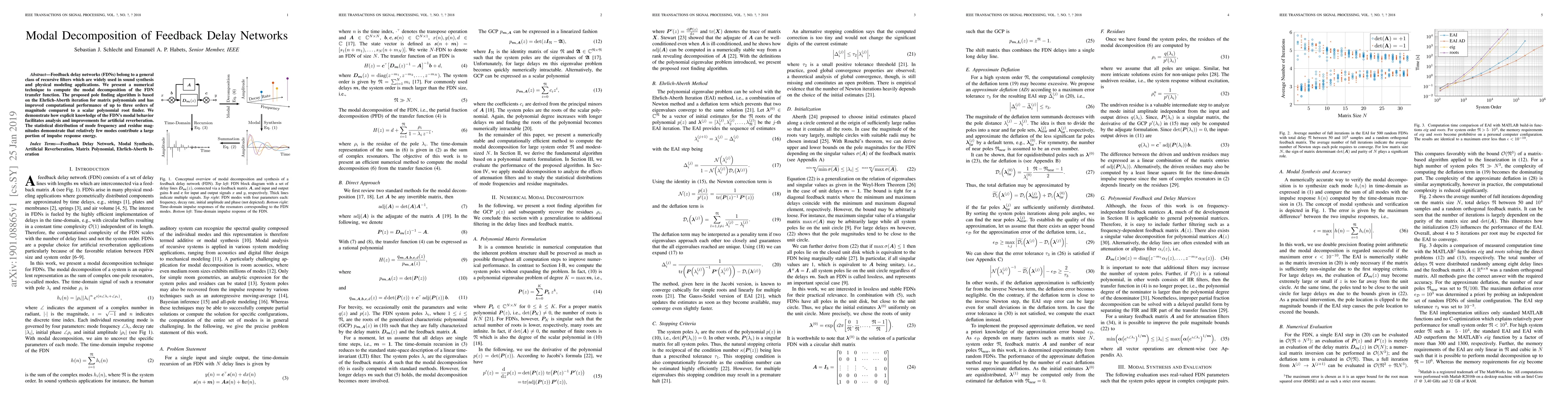 Feedback delay networks (FDNs) belong to a general class of recursive filters which are widely used in sound synthesis and physical modeling applications. We present a numerical technique to compute the modal decomposition of the FDN transfer function. The proposed pole finding algorithm is based on the Ehrlich-Aberth iteration for matrix polynomials and has improved computational performance of up to three orders of magnitude compared to a scalar polynomial root finder. We demonstrate how explicit knowledge of the FDN's modal behavior facilitates analysis and improvements for artificial reverberation. The statistical distribution of mode frequency and residue magnitudes demonstrate that relatively few modes contribute a large portion of impulse response energy.
