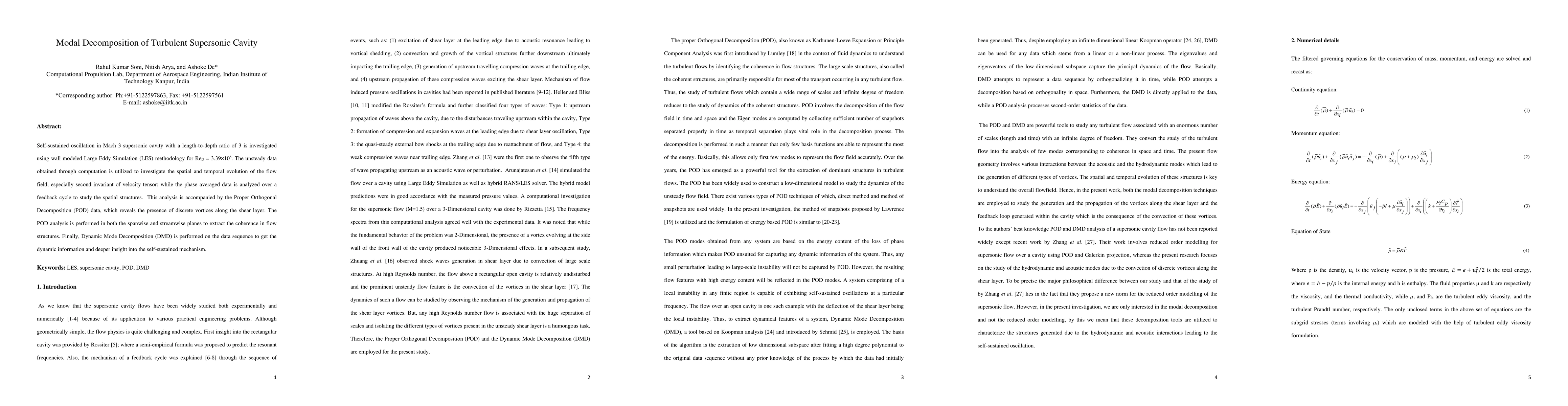 This paper investigates the self-sustained oscillations in a Mach 3 supersonic cavity using wall-modeled Large Eddy Simulation and Proper Orthogonal Decomposition (POD) to reveal discrete vortex structures. Dynamic Mode Decomposition (DMD) further provides insight into the dynamic mechanisms sustaining the oscillations.