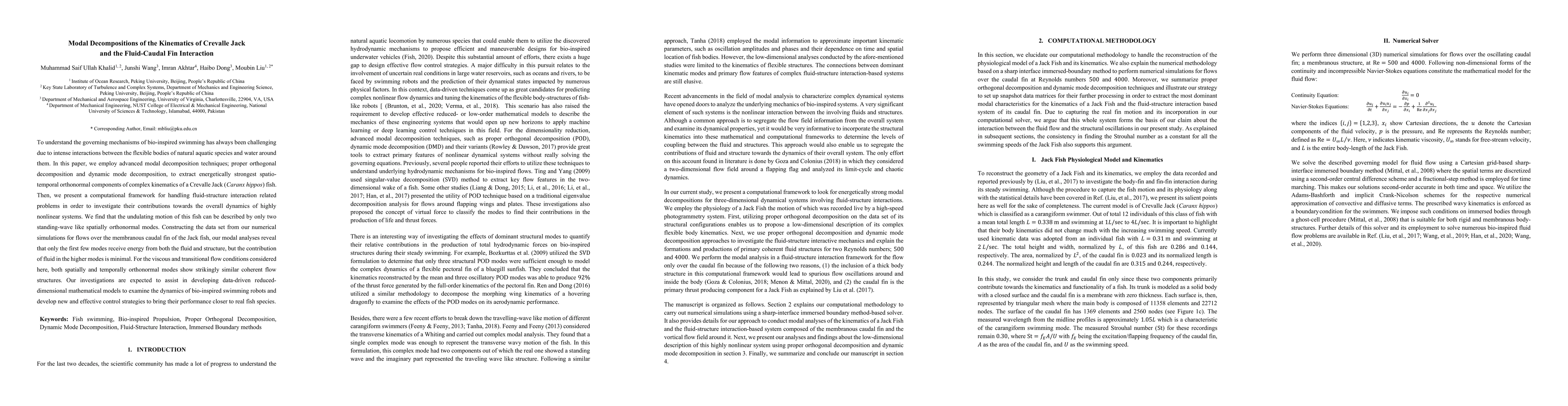 To understand the governing mechanisms of bio-inspired swimming has always been challenging due to intense interactions between the flexible bodies of natural aquatic species and water around them. In this paper, we employ advanced modal decomposition techniques; proper orthogonal decomposition and dynamic mode decomposition, to extract energetically strongest spatio-temporal orthonormal components of complex kinematics of a Crevalle Jack (Caranx hippos) fish. Then, we present a computational framework for handling fluid-structure interaction related problems in order to investigate their contributions towards the overall dynamics of highly nonlinear systems. We find that the undulating motion of this fish can be described by only two standing-wave like spatially orthonormal modes. Constructing the data set from our numerical simulations for flows over the membranous caudal fin of the Jack fish, our modal analyses reveal that only the first few modes receive energy from both the fluid and structure, but the contribution of fluid in the higher modes is minimal. For the viscous and transitional flow conditions considered here, both spatially and temporally orthonormal modes show strikingly similar coherent flow structures. Our investigations are expected to assist in developing data-driven reduced-dimensional mathematical models to examine the dynamics of bio-inspired swimming robots and develop new and effective control strategies to bring their performance closer to real fish species.