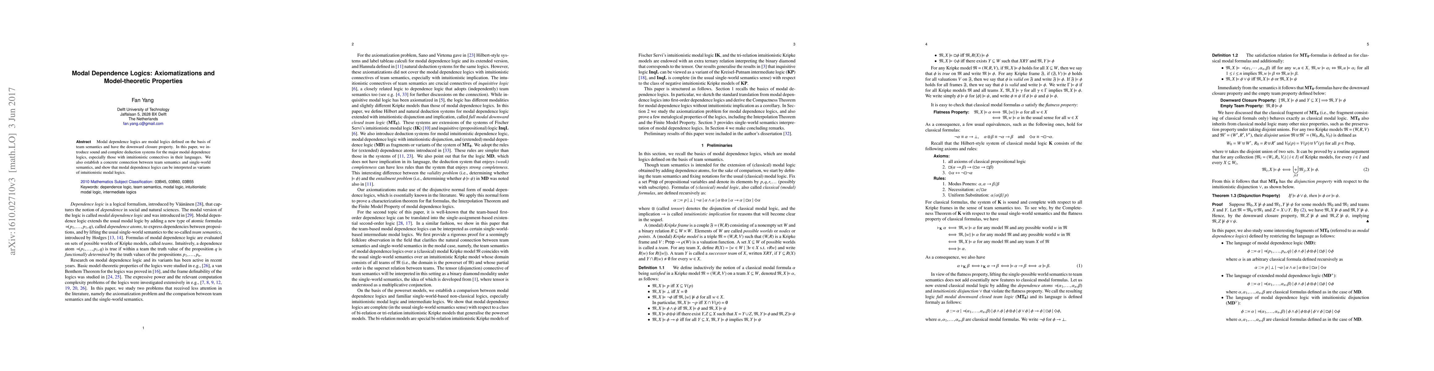 Modal dependence logics are modal logics defined on the basis of team semantics and have the downward closure property. In this paper, we introduce sound and complete deduction systems for the major modal dependence logics, especially those with intuitionistic connectives in their languages. We also establish a concrete connection between team semantics and single-world semantics, and show that modal dependence logics can be interpreted as variants of intuitionistic modal logics.