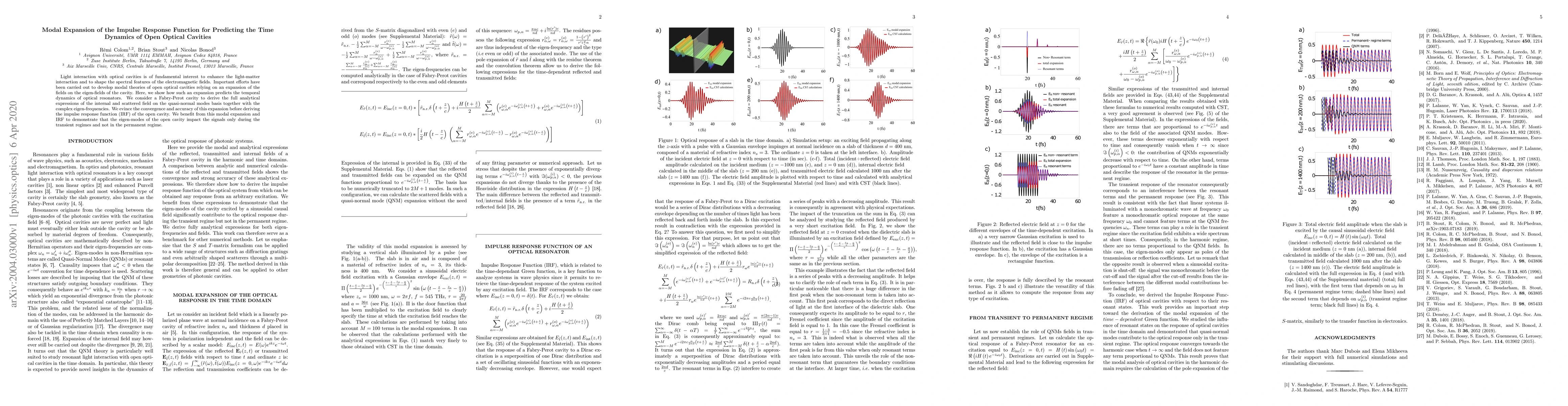 Light interaction with optical cavities is of fundamental interest to enhance the light-matter interaction and to shape the spectral features of the electromagnetic fields. Important efforts have been carried out to develop modal theories of open optical cavities relying on an expansion of the fields on the eigen-fields of the cavity. Here, we show how such an expansion predicts the temporal dynamics of optical resonators. We consider a Fabry-Perot cavity to derive the full analytical expressions of the internal and scattered field on the quasi-normal modes basis together with the complex eigen-frequencies. We evince the convergence and accuracy of this expansion before deriving the impulse response function (IRF) of the open cavity. We benefit from this modal expansion and IRF to demonstrate that the eigen-modes of the open cavity impact the signals only during the transient regimes and not in the permanent regime.