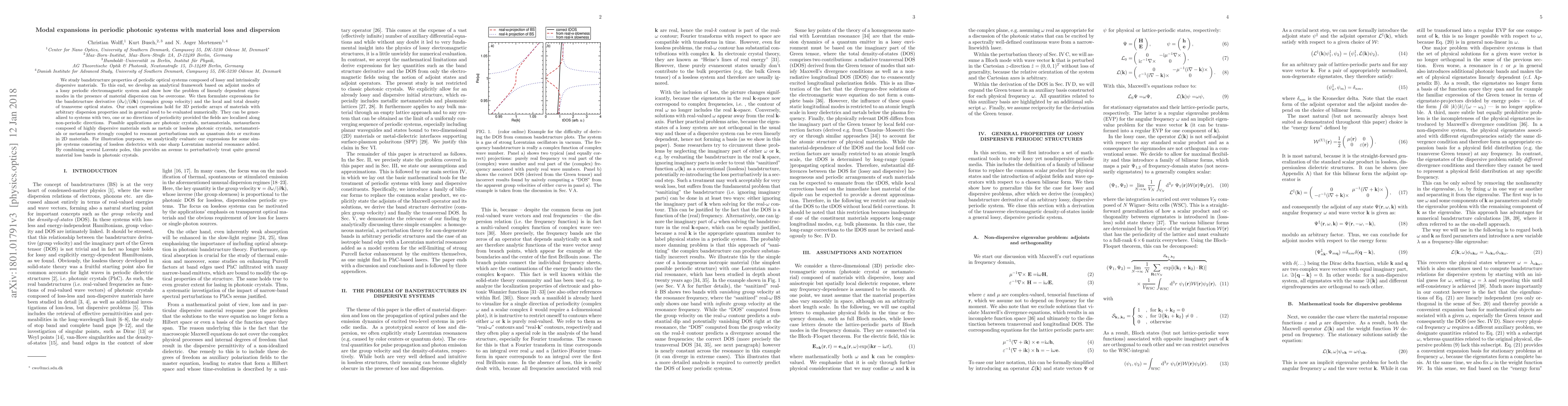 This paper develops an analytical framework to study bandstructure properties of periodic optical systems with lossy materials and dispersion, providing expressions for complex group velocity and density of transverse optical states.