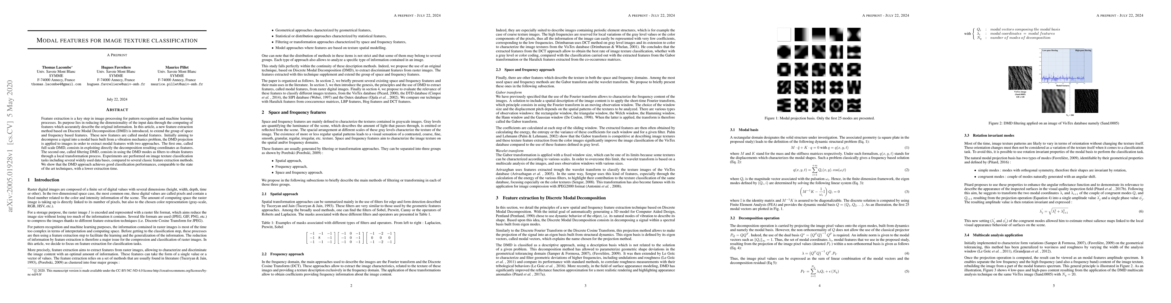 A new feature extraction method using Discrete Modal Decomposition (DMD) is introduced to improve image texture classification, achieving comparable performance to state-of-the-art techniques with faster extraction times.