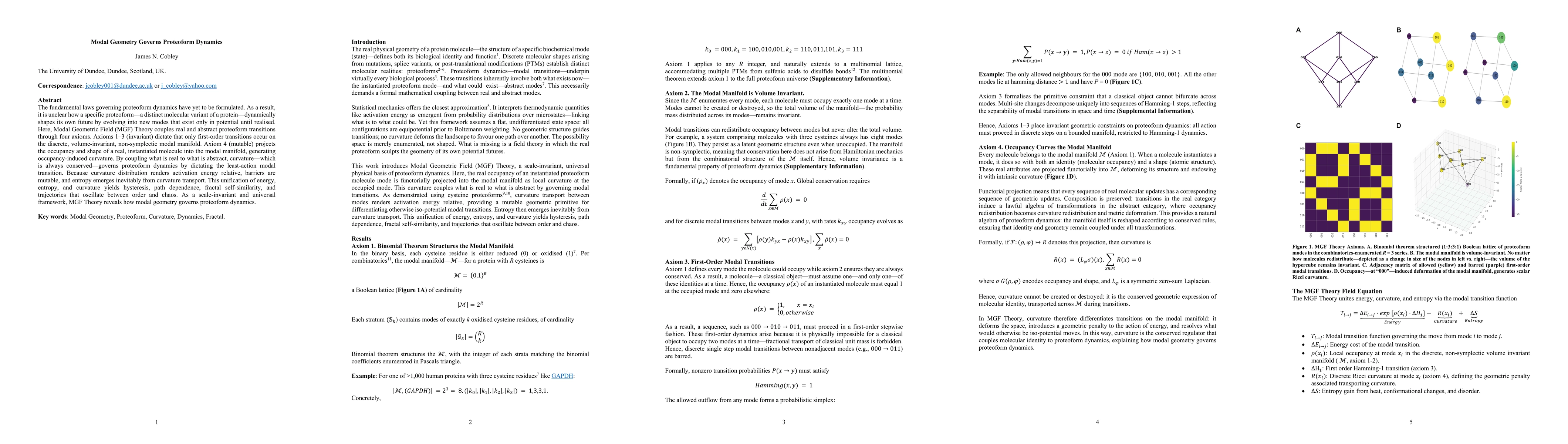 The fundamental laws governing proteoform dynamics have yet to be formulated. As a result, it is unclear how a specific proteoform, a distinct molecular variant of a protein, dynamically shapes its own future by evolving into new modes that exist only in potential until realised. Here, Modal Geometric Field (MGF) Theory couples real and abstract proteoform transitions through four axioms. Axioms 1 to 3 (invariant) dictate that only first-order transitions occur on the discrete, volume-invariant, non symplectic modal manifold. Axiom 4 (mutable) projects the occupancy and shape of a real, instantiated molecule into the modal manifold, generating occupancy-induced curvature. By coupling what is real to what is abstract, curvature, which is always conserved, governs proteoform dynamics by dictating the least-action modal transition. Because curvature distribution renders activation energy relative, barriers are mutable, and entropy emerges inevitably from curvature transport. This unification of energy, entropy, and curvature yields hysteresis, path dependence, fractal self similarity, and trajectories that oscillate between order and chaos. As a scale invariant and universal framework, MGF Theory reveals how modal geometry governs proteoform dynamics