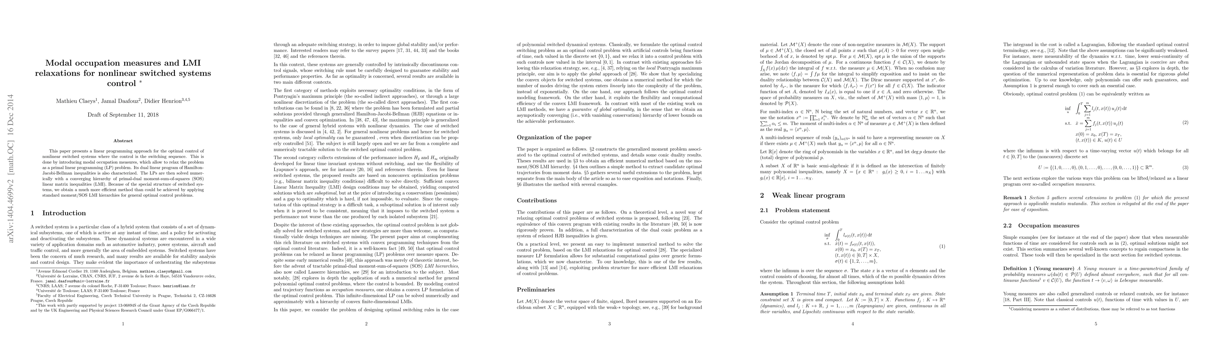 This paper proposes a linear programming approach for optimal control of nonlinear switched systems, utilizing modal occupation measures to formulate a primal LP problem. The dual problem is characterized via Hamilton-Jacobi-Bellman inequalities, solved using a hierarchy of primal-dual moment-sum-of-squares LMI relaxations, resulting in a more efficient method than general optimal control techniques.