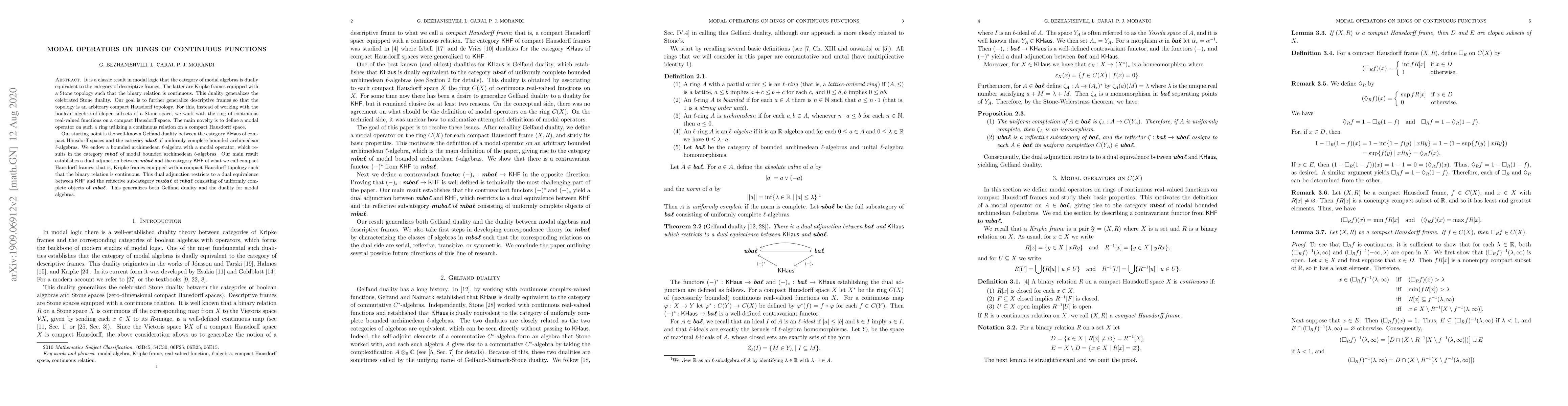 It is a classic result in modal logic that the category of modal algebras is dually equivalent to the category of descriptive frames. The latter are Kripke frames equipped with a Stone topology such that the binary relation is continuous. This duality generalizes the celebrated Stone duality. Our goal is to further generalize descriptive frames so that the topology is an arbitrary compact Hausdorff topology. For this, instead of working with the boolean algebra of clopen subsets of a Stone space, we work with the ring of continuous real-valued functions on a compact Hausdorff space. The main novelty is to define a modal operator on such a ring utilizing a continuous relation on a compact Hausdorff space. Our starting point is the well-known Gelfand duality between the category $KHaus$ of compact Hausdorff spaces and the category $ubal$ of uniformly complete bounded archimedean $\ell$-algebras. We endow a bounded archimedean $\ell$-algebra with a modal operator, which results in the category $mbal$ of modal bounded archimedean $\ell$-algebras. Our main result establishes a dual adjunction between $mbal$ and the category $KHK$ of what we call compact Hausdorff frames; that is, Kripke frames equipped with a compact Hausdorff topology such that the binary relation is continuous. This dual adjunction restricts to a dual equivalence between $KHK$ and the reflective subcategory $mubal$ of $mbal$ consisting of uniformly complete objects of $mbal$. This generalizes both Gelfand duality and the duality for modal algebras.