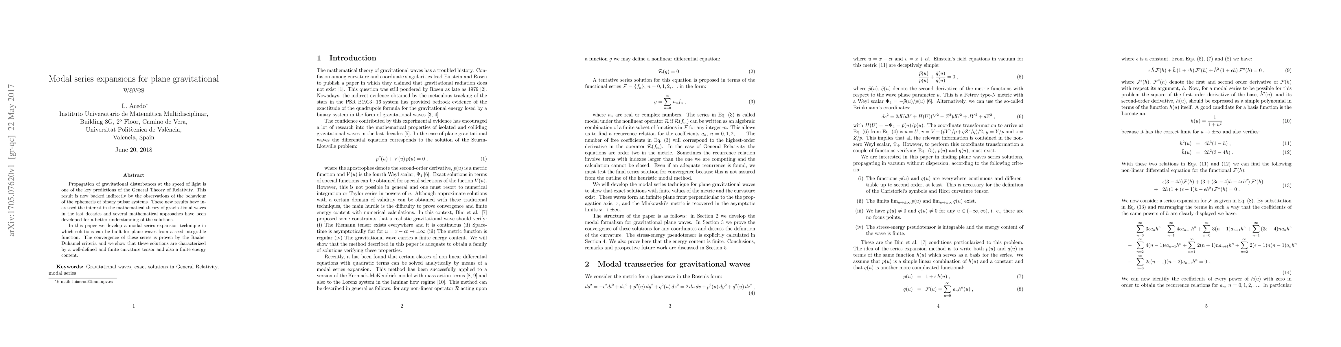 Propagation of gravitational disturbances at the speed of light is one of the key predictions of the General Theory of Relativity. This result is now backed indirectly by the observations of the behaviour of the ephemeris of binary pulsar systems. These new results have in- creased the interest in the mathematical theory of gravitational waves in the last decades and several mathematical approaches have been developed for a better understanding of the solutions. In this paper we develop a modal series expansion technique in which solutions can be built for plane waves from a seed integrable function. The convergence of these series is proven by the Raabe- Duhamel criteria and we show that these solutions are characterized by a well-defined and finite curvature tensor and also a finite energy content.