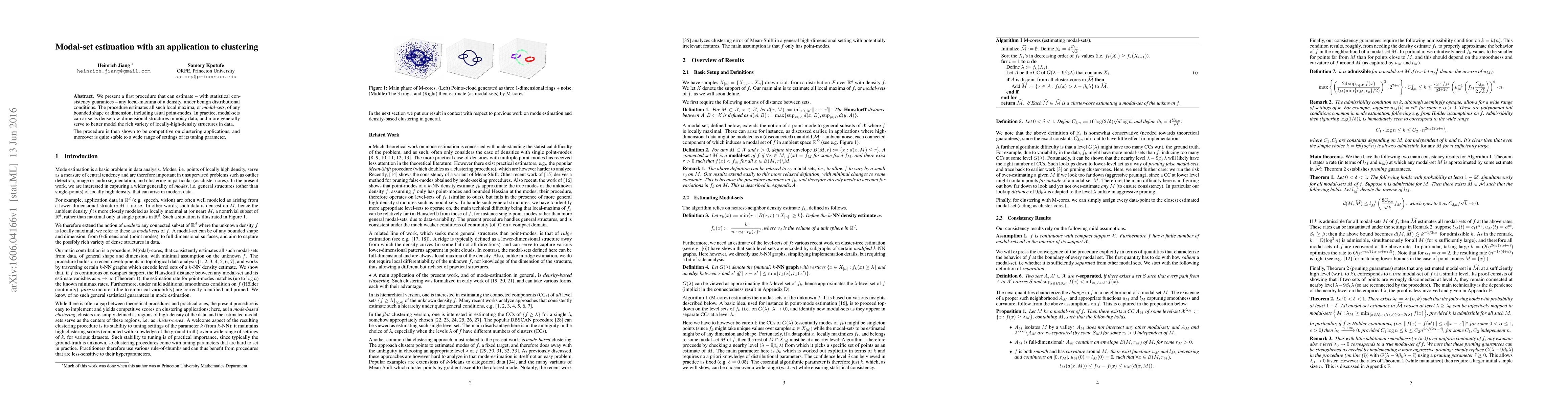 We present a first procedure that can estimate -- with statistical consistency guarantees -- any local-maxima of a density, under benign distributional conditions. The procedure estimates all such local maxima, or $\textit{modal-sets}$, of any bounded shape or dimension, including usual point-modes. In practice, modal-sets can arise as dense low-dimensional structures in noisy data, and more generally serve to better model the rich variety of locally-high-density structures in data. The procedure is then shown to be competitive on clustering applications, and moreover is quite stable to a wide range of settings of its tuning parameter.