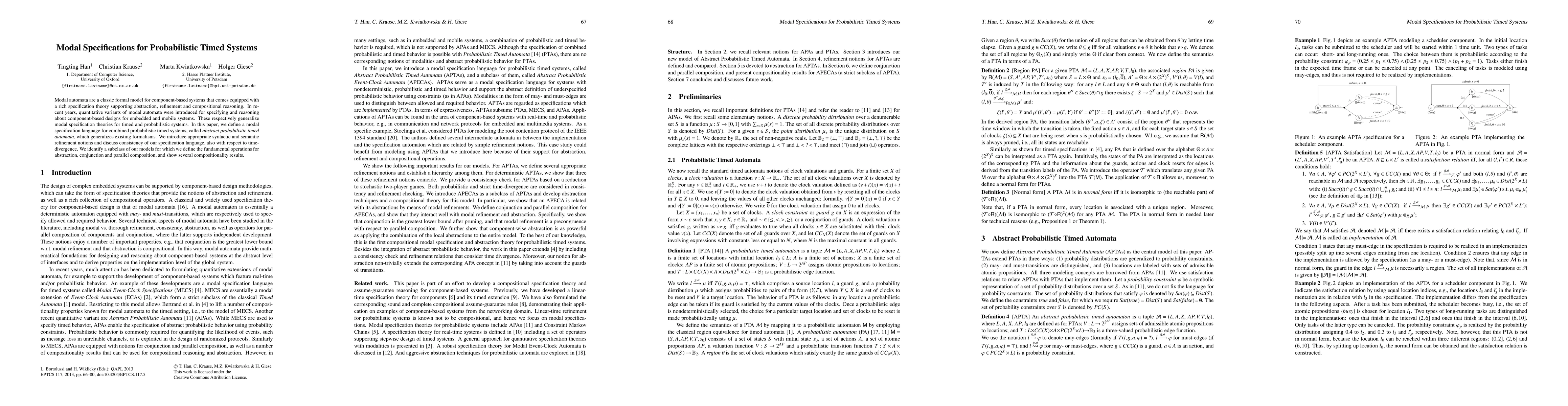 This paper introduces a modal specification language for probabilistic timed systems, termed abstract probabilistic timed automata, which generalizes existing formalisms. It discusses syntactic and semantic refinements, consistency, and compositionality results for a subclass of these models.
