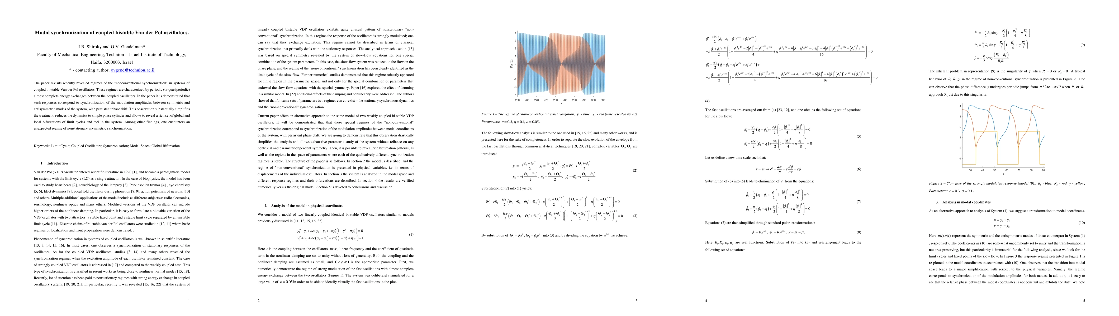 The paper explores "nonconventional synchronization" in coupled bistable Van der Pol oscillators, characterized by periodic energy exchanges. It reveals synchronization of modulation amplitudes with persistent phase drift, simplifying dynamics and revealing bifurcations of limit cycles and tori, including an unexpected nonstationary asymmetric synchronization regime.