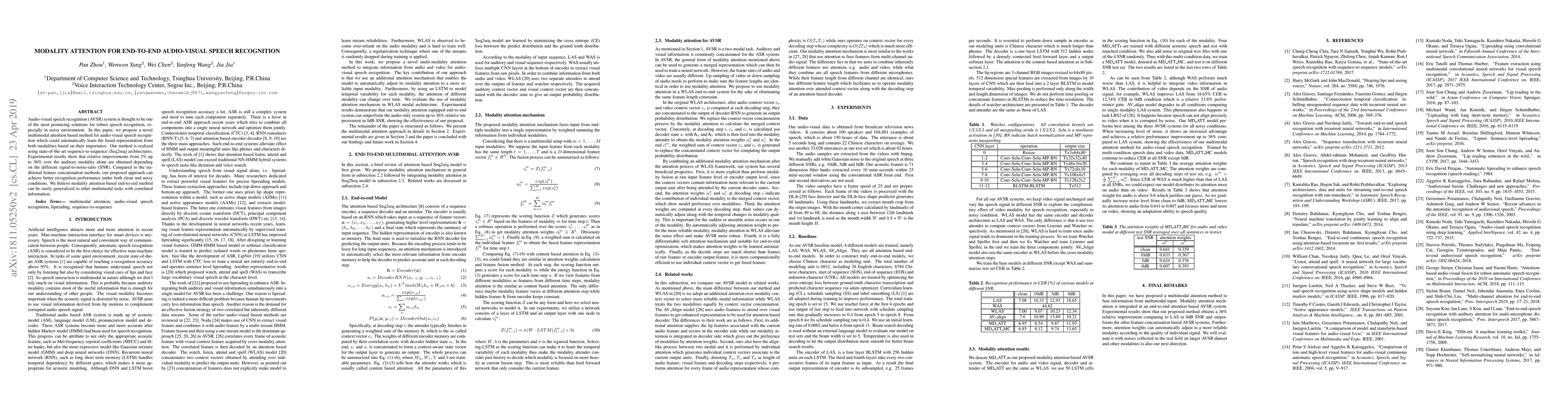 This paper proposes a novel modality attention-based method for audio-visual speech recognition, achieving better performance in noisy environments by automatically learning the fused representation from both audio and visual modalities. The method demonstrates significant improvements over traditional auditory-only recognition, especially under low signal-to-noise ratios.
