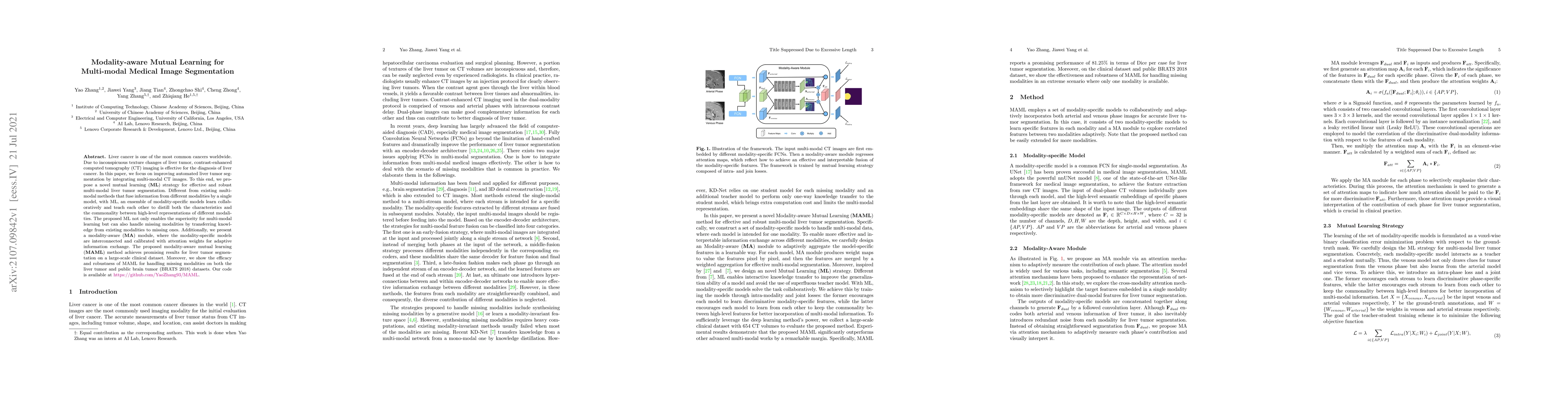 This paper proposes a modality-aware mutual learning (MAML) strategy for improving liver tumor segmentation using multi-modal CT images. The method employs an ensemble of modality-specific models that collaboratively learn and transfer knowledge, achieving superior multi-modal segmentation and handling missing modalities effectively.