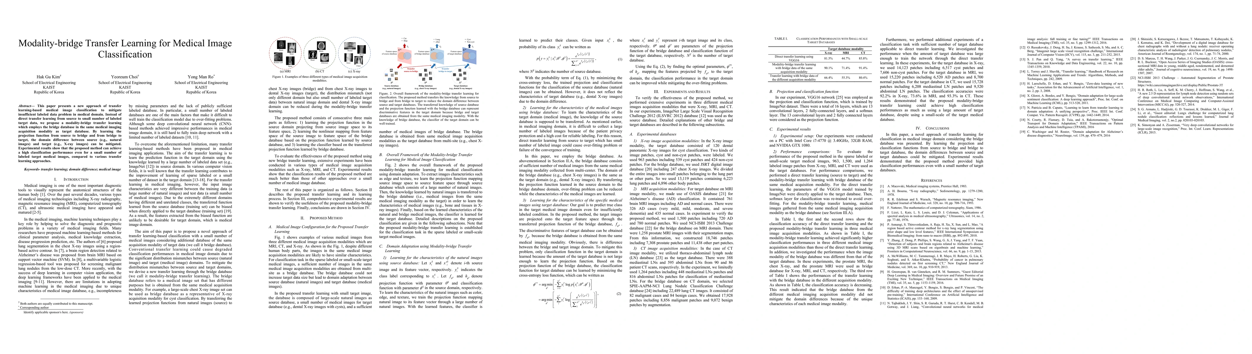 This paper presents a new approach of transfer learning-based medical image classification to mitigate insufficient labeled data problem in medical domain. Instead of direct transfer learning from source to small number of labeled target data, we propose a modality-bridge transfer learning which employs the bridge database in the same medical imaging acquisition modality as target database. By learning the projection function from source to bridge and from bridge to target, the domain difference between source (e.g., natural images) and target (e.g., X-ray images) can be mitigated. Experimental results show that the proposed method can achieve a high classification performance even for a small number of labeled target medical images, compared to various transfer learning approaches.