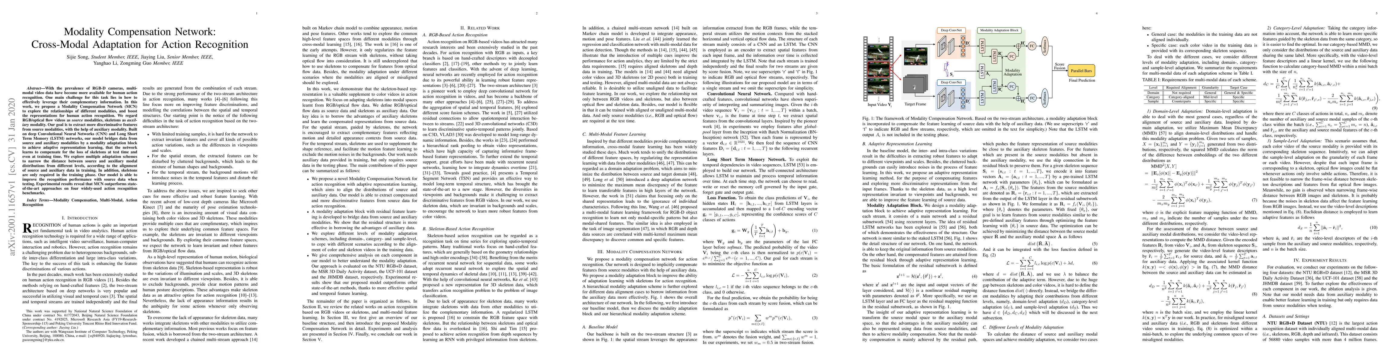 The Modality Compensation Network (MCN) leverages complementary information from RGB/optical flow videos and skeleton data to enhance human action recognition. The model uses deep CNNs and LSTMs, with a modality adaptation block to bridge source and auxiliary modalities, achieving adaptive representation learning and improving recognition performance.