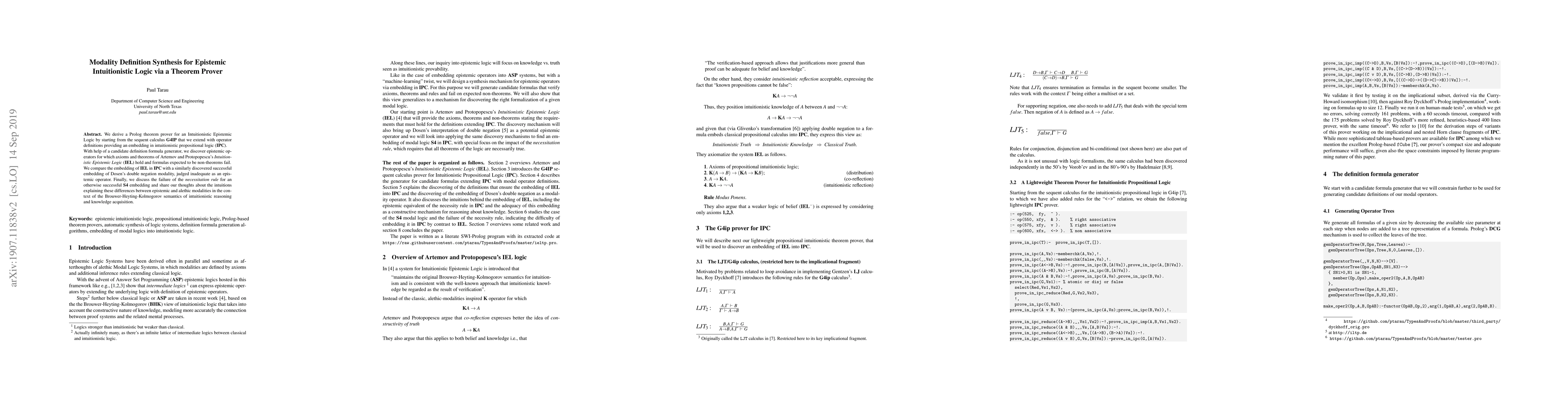 We derive a Prolog theorem prover for an Intuitionistic Epistemic Logic by starting from the sequent calculus {\bf G4IP} that we extend with operator definitions providing an embedding in intuitionistic propositional logic ({\bf IPC}). With help of a candidate definition formula generator, we discover epistemic operators for which axioms and theorems of Artemov and Protopopescu's {\em Intuitionistic Epistemic Logic} ({\bf IEL}) hold and formulas expected to be non-theorems fail. We compare the embedding of {\bf IEL} in {\bf IPC} with a similarly discovered successful embedding of Dosen's double negation modality, judged inadequate as an epistemic operator. Finally, we discuss the failure of the {\em necessitation rule} for an otherwise successful {\bf S4} embedding and share our thoughts about the intuitions explaining these differences between epistemic and alethic modalities in the context of the Brouwer-Heyting-Kolmogorov semantics of intuitionistic reasoning and knowledge acquisition. Keywords: epistemic intuitionistic logic, propositional intuitionistic logic, Prolog-based theorem provers, automatic synthesis of logic systems, definition formula generation algorithms, embedding of modal logics into intuitionistic logic.