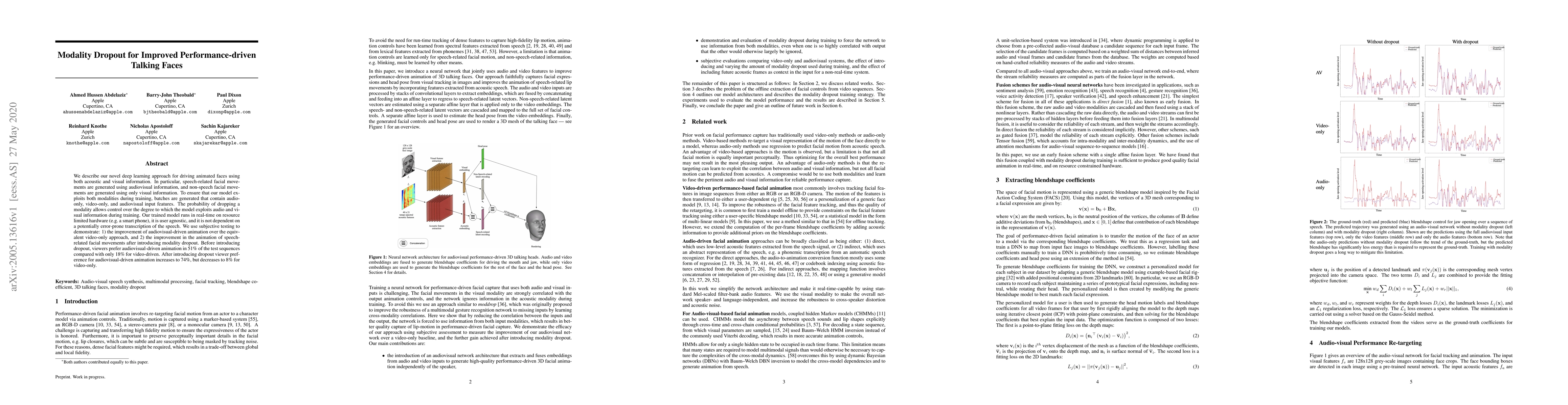 We describe our novel deep learning approach for driving animated faces using both acoustic and visual information. In particular, speech-related facial movements are generated using audiovisual information, and non-speech facial movements are generated using only visual information. To ensure that our model exploits both modalities during training, batches are generated that contain audio-only, video-only, and audiovisual input features. The probability of dropping a modality allows control over the degree to which the model exploits audio and visual information during training. Our trained model runs in real-time on resource limited hardware (e.g.\ a smart phone), it is user agnostic, and it is not dependent on a potentially error-prone transcription of the speech. We use subjective testing to demonstrate: 1) the improvement of audiovisual-driven animation over the equivalent video-only approach, and 2) the improvement in the animation of speech-related facial movements after introducing modality dropout. Before introducing dropout, viewers prefer audiovisual-driven animation in 51% of the test sequences compared with only 18% for video-driven. After introducing dropout viewer preference for audiovisual-driven animation increases to 74%, but decreases to 8% for video-only.