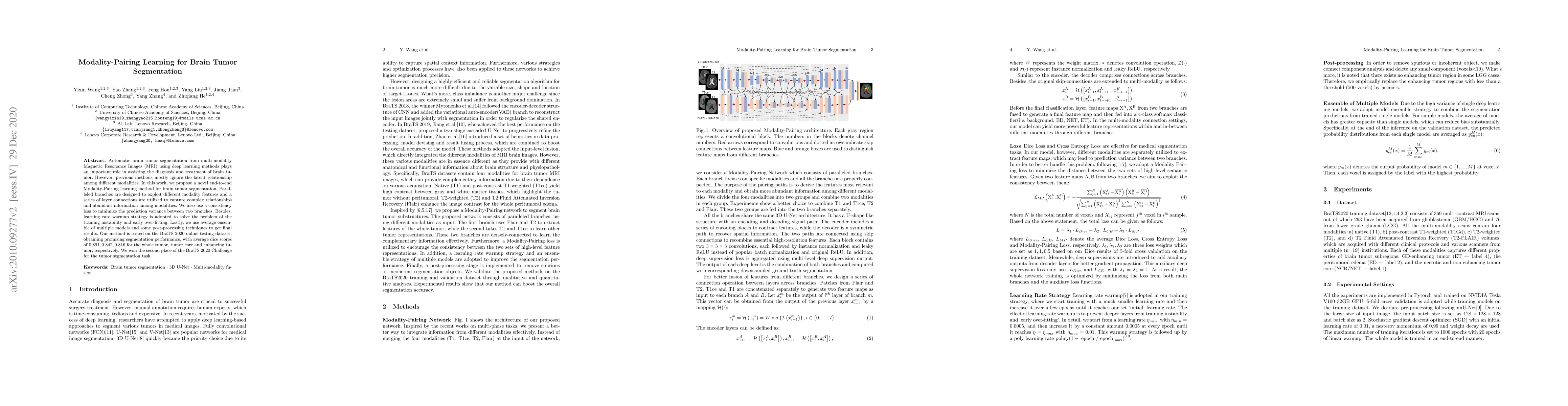 This paper proposes a novel end-to-end Modality-Pairing learning method for brain tumor segmentation using multi-modality MRIs, emphasizing the exploitation of relationships between different modalities to achieve better segmentation performance. The method won second place in the BraTS 2020 Challenge, achieving average dice scores of 0.891, 0.842, and 0.816 for whole tumor, tumor core, and enhancing tumor, respectively.