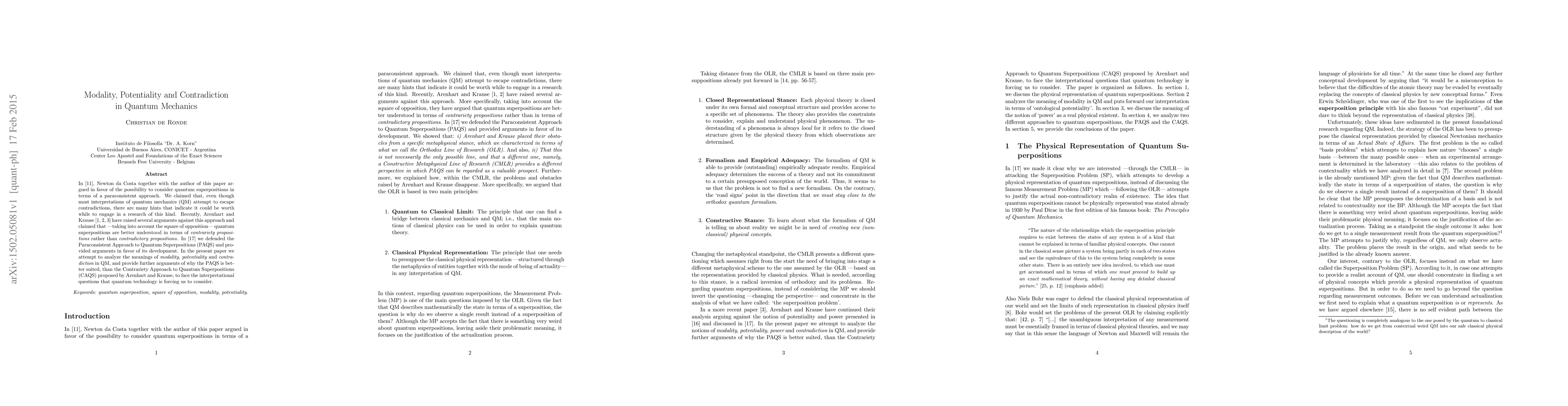 In [11], Newton da Costa together with the author of this paper argued in favor of the possibility to consider quantum superpositions in terms of a paraconsistent approach. We claimed that, even though most interpretations of quantum mechanics (QM) attempt to escape contradictions, there are many hints that indicate it could be worth while to engage in a research of this kind. Recently, Arenhart and Krause [1, 2, 3] have raised several arguments against this approach and claimed that, taking into account the square of opposition, quantum superpositions are better understood in terms of contrariety propositions rather than contradictory propositions. In [17] we defended the Paraconsistent Approach to Quantum Superpositions (PAQS) and provided arguments in favor of its development. In the present paper we attempt to analyze the meanings of modality, potentiality and contradiction in QM, and provide further arguments of why the PAQS is better suited, than the Contrariety Approach to Quantum Superpositions (CAQS) proposed by Arenhart and Krause, to face the interpretational questions that quantum technology is forcing us to consider.
