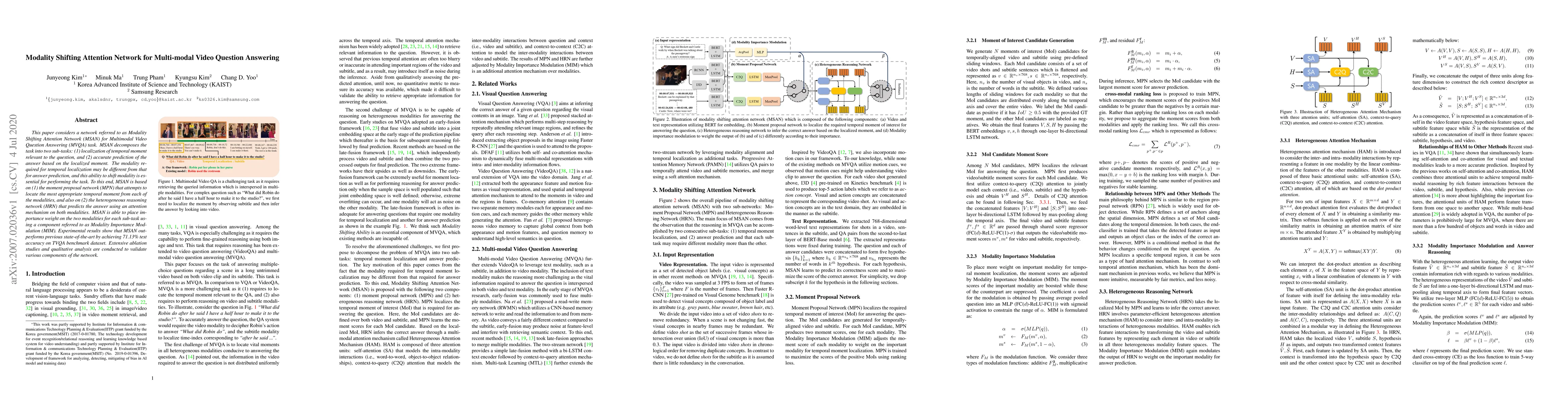 This paper considers a network referred to as Modality Shifting Attention Network (MSAN) for Multimodal Video Question Answering (MVQA) task. MSAN decomposes the task into two sub-tasks: (1) localization of temporal moment relevant to the question, and (2) accurate prediction of the answer based on the localized moment. The modality required for temporal localization may be different from that for answer prediction, and this ability to shift modality is essential for performing the task. To this end, MSAN is based on (1) the moment proposal network (MPN) that attempts to locate the most appropriate temporal moment from each of the modalities, and also on (2) the heterogeneous reasoning network (HRN) that predicts the answer using an attention mechanism on both modalities. MSAN is able to place importance weight on the two modalities for each sub-task using a component referred to as Modality Importance Modulation (MIM). Experimental results show that MSAN outperforms previous state-of-the-art by achieving 71.13\% test accuracy on TVQA benchmark dataset. Extensive ablation studies and qualitative analysis are conducted to validate various components of the network.