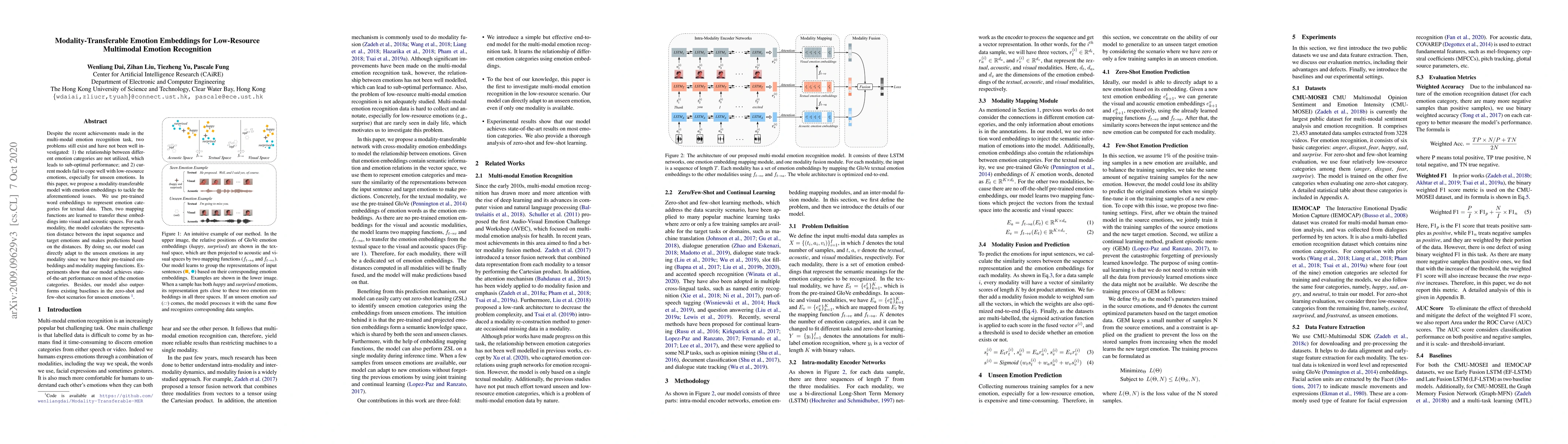 This paper proposes a modality-transferable model with emotion embeddings to enhance low-resource multimodal emotion recognition, addressing the underutilization of emotion category relationships and the challenge of unseen emotions. The model uses pre-trained word embeddings and mapping functions to adapt to unseen emotions across modalities, achieving state-of-the-art performance and outperforming baselines in zero-shot and few-shot scenarios.