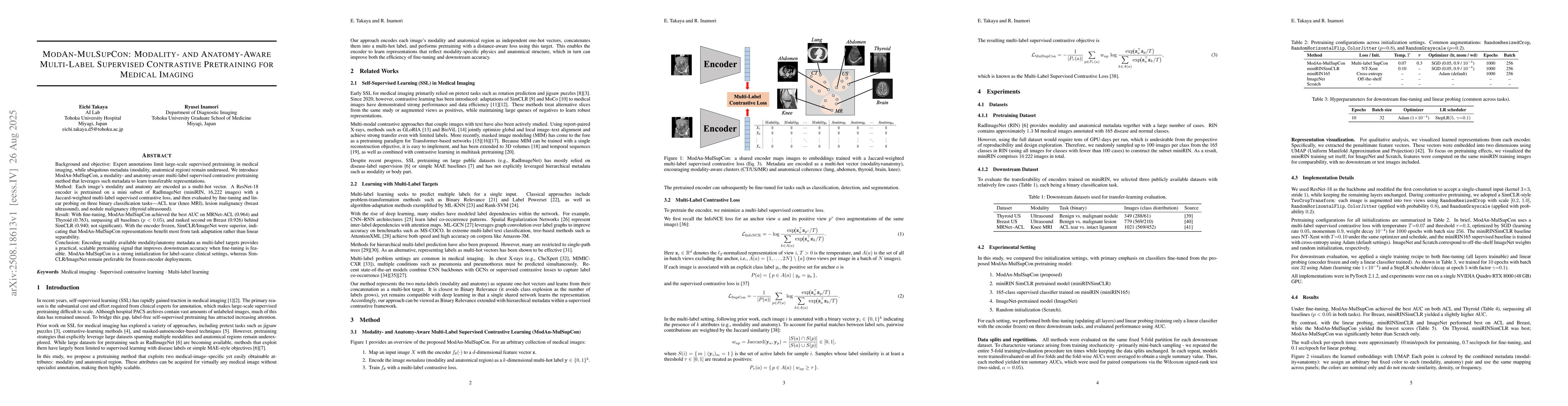 Background and objective: Expert annotations limit large-scale supervised pretraining in medical imaging, while ubiquitous metadata (modality, anatomical region) remain underused. We introduce ModAn-MulSupCon, a modality- and anatomy-aware multi-label supervised contrastive pretraining method that leverages such metadata to learn transferable representations. Method: Each image's modality and anatomy are encoded as a multi-hot vector. A ResNet-18 encoder is pretrained on a mini subset of RadImageNet (miniRIN, 16,222 images) with a Jaccard-weighted multi-label supervised contrastive loss, and then evaluated by fine-tuning and linear probing on three binary classification tasks--ACL tear (knee MRI), lesion malignancy (breast ultrasound), and nodule malignancy (thyroid ultrasound). Result: With fine-tuning, ModAn-MulSupCon achieved the best AUC on MRNet-ACL (0.964) and Thyroid (0.763), surpassing all baselines ($p<0.05$), and ranked second on Breast (0.926) behind SimCLR (0.940; not significant). With the encoder frozen, SimCLR/ImageNet were superior, indicating that ModAn-MulSupCon representations benefit most from task adaptation rather than linear separability. Conclusion: Encoding readily available modality/anatomy metadata as multi-label targets provides a practical, scalable pretraining signal that improves downstream accuracy when fine-tuning is feasible. ModAn-MulSupCon is a strong initialization for label-scarce clinical settings, whereas SimCLR/ImageNet remain preferable for frozen-encoder deployments.