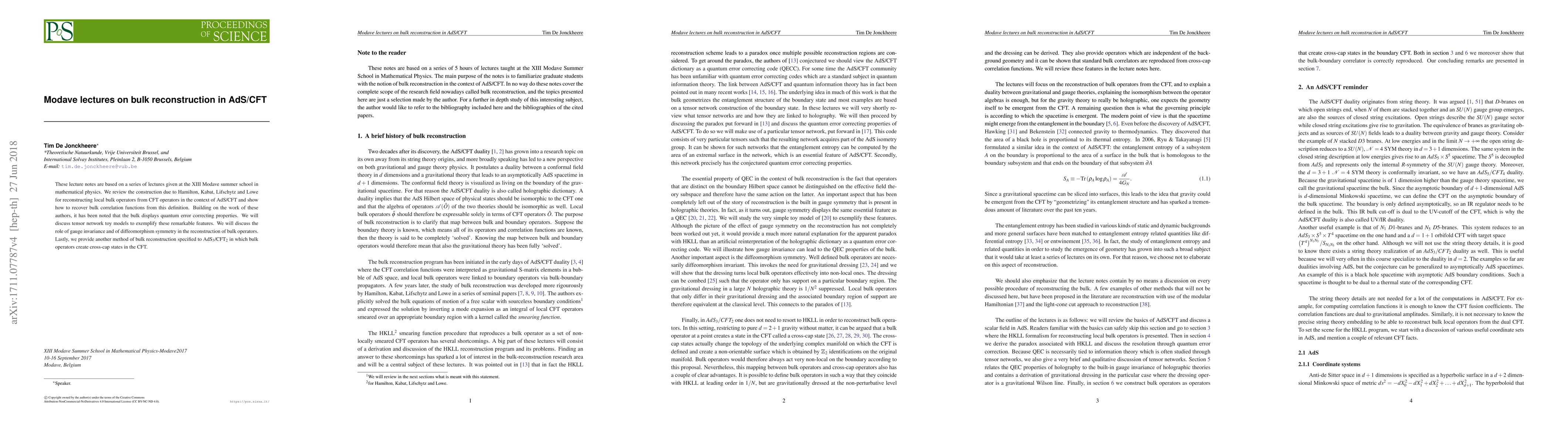 These lecture notes review the reconstruction of local bulk operators from CFT operators in AdS/CFT, emphasizing the quantum error-correcting properties of the bulk and the role of gauge and diffeomorphism symmetries. They also introduce a specialized method for AdS$_3$/CFT$_2$ that creates cross-cap states in the CFT.