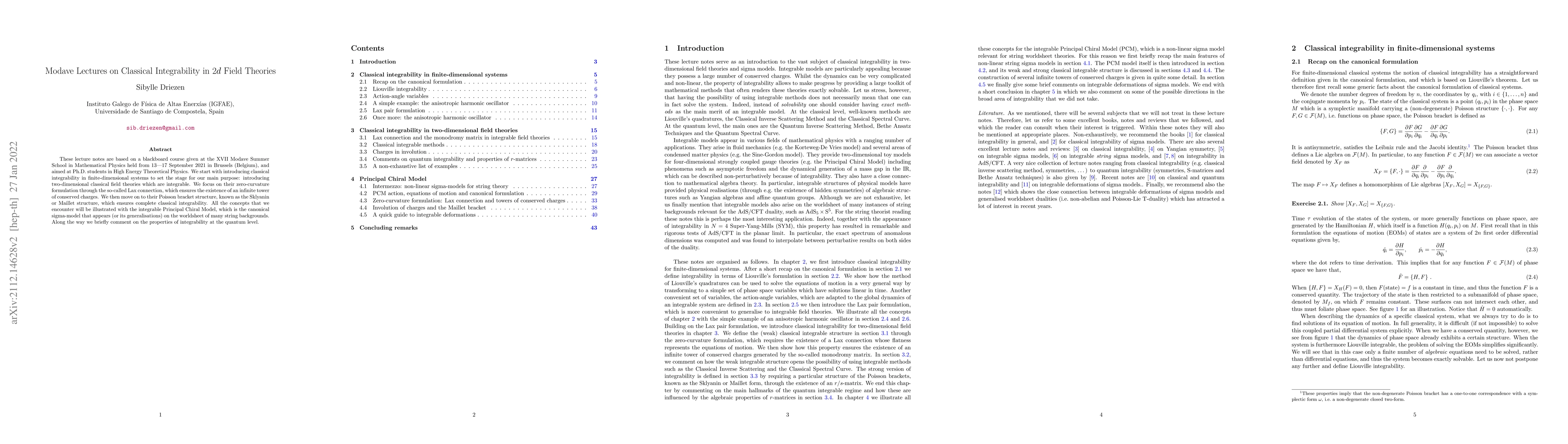 These lecture notes are based on a blackboard course given at the XVII Modave Summer School in Mathematical Physics held from 13 -- 17 September 2021 in Brussels (Belgium), and aimed at Ph.D. students in High Energy Theoretical Physics. We start with introducing classical integrability in finite-dimensional systems to set the stage for our main purpose: introducing two-dimensional classical field theories which are integrable. We focus on their zero-curvature formulation through the so-called Lax connection, which ensures the existence of an infinite tower of conserved charges. We then move on to their Poisson bracket structure, known as the Sklyanin or Maillet structure, which ensures complete classical integrability. All the concepts that we encounter will be illustrated with the integrable Principal Chiral Model, which is the canonical sigma-model that appears (or its generalisations) on the worldsheet of many string backgrounds. Along the way we briefly comment on the properties of integrability at the quantum level.