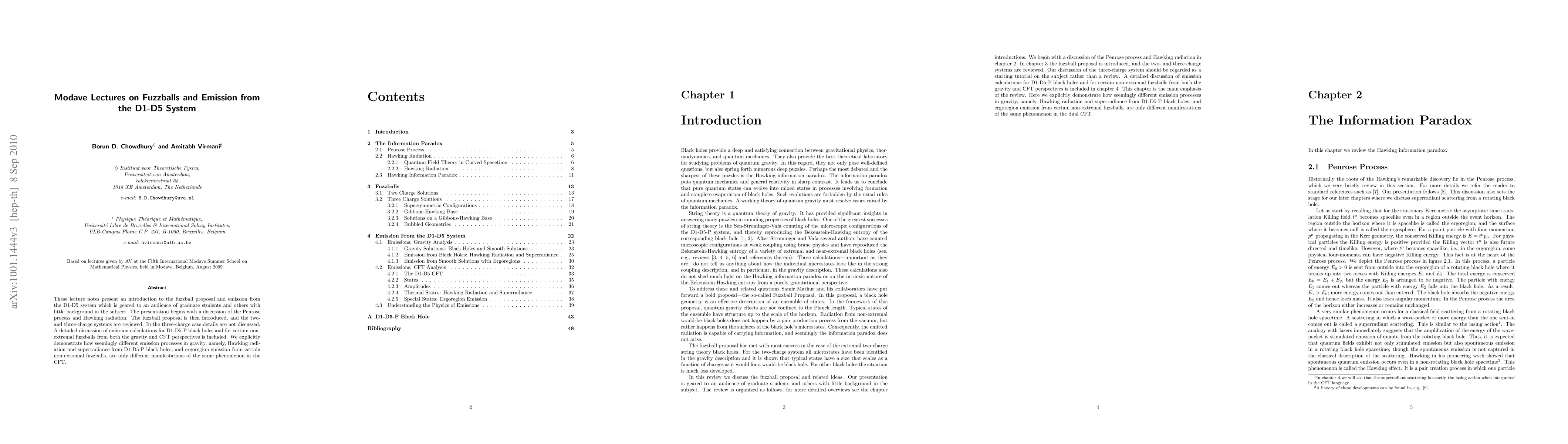 These lecture notes present an introduction to the fuzzball proposal and emission from the D1-D5 system which is geared to an audience of graduate students and others with little background in the subject. The presentation begins with a discussion of the Penrose process and Hawking radiation. The fuzzball proposal is then introduced, and the two- and three-charge systems are reviewed. In the three-charge case details are not discussed. A detailed discussion of emission calculations for D1-D5-P black holes and for certain non-extremal fuzzballs from both the gravity and CFT perspectives is included. We explicitly demonstrate how seemingly different emission processes in gravity, namely, Hawking radiation and superradiance from D1-D5-P black holes, and ergoregion emission from certain non-extremal fuzzballs, are only different manifestations of the same phenomenon in the CFT.