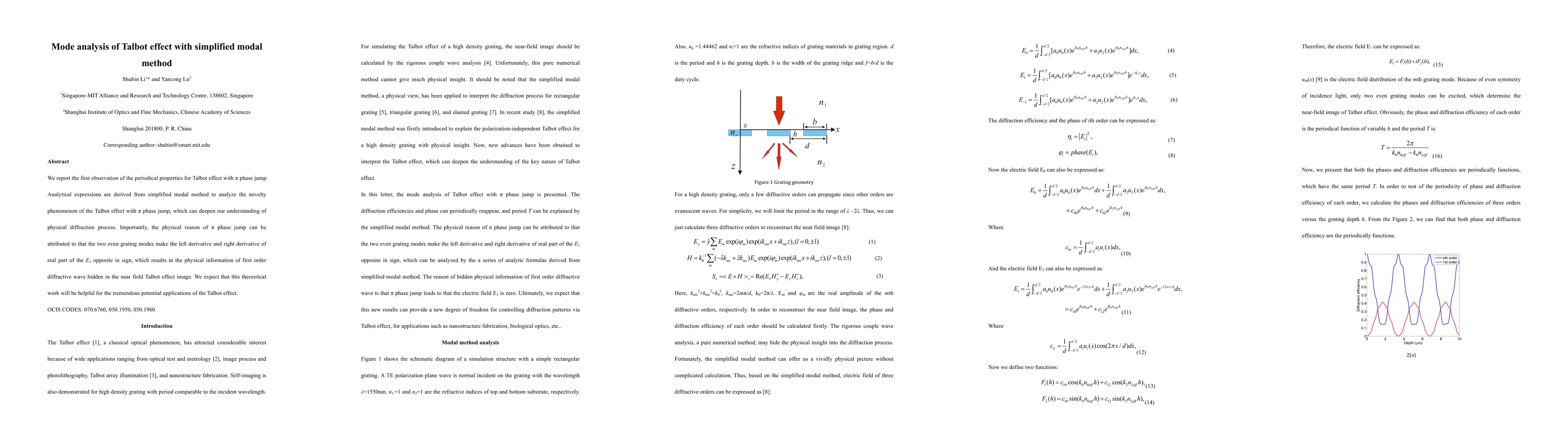This paper presents the first observation of the periodic properties of the Talbot effect with a π phase jump, using a simplified modal method to derive analytical expressions. The π phase jump is attributed to the interaction of two even grating modes, revealing hidden information in the near-field Talbot effect image, which could enhance applications of the Talbot effect.