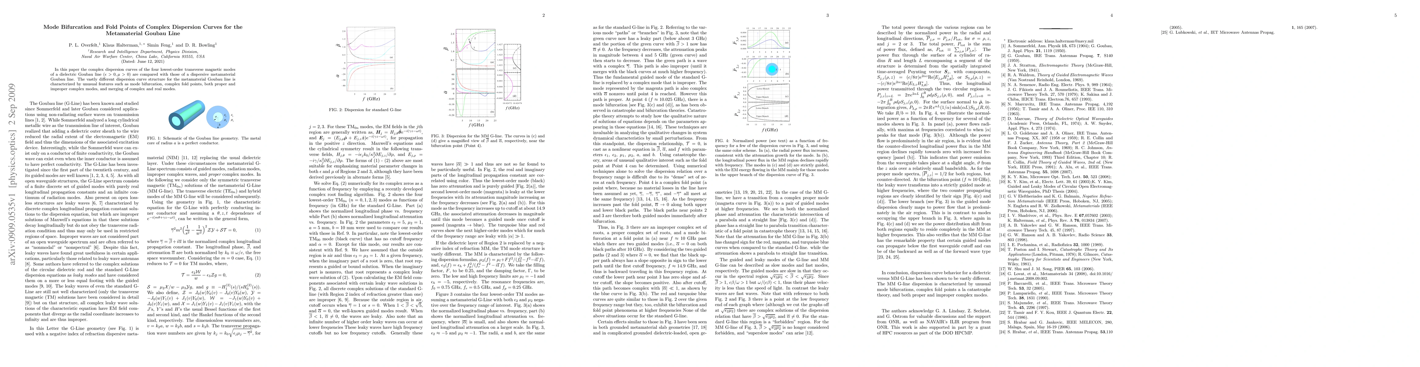 This study compares the complex dispersion curves of the four lowest-order transverse magnetic modes between a standard dielectric Goubau line and a dispersive metamaterial Goubau line, highlighting unusual features such as mode bifurcation, complex fold points, and merging of complex and real modes in the metamaterial variant.