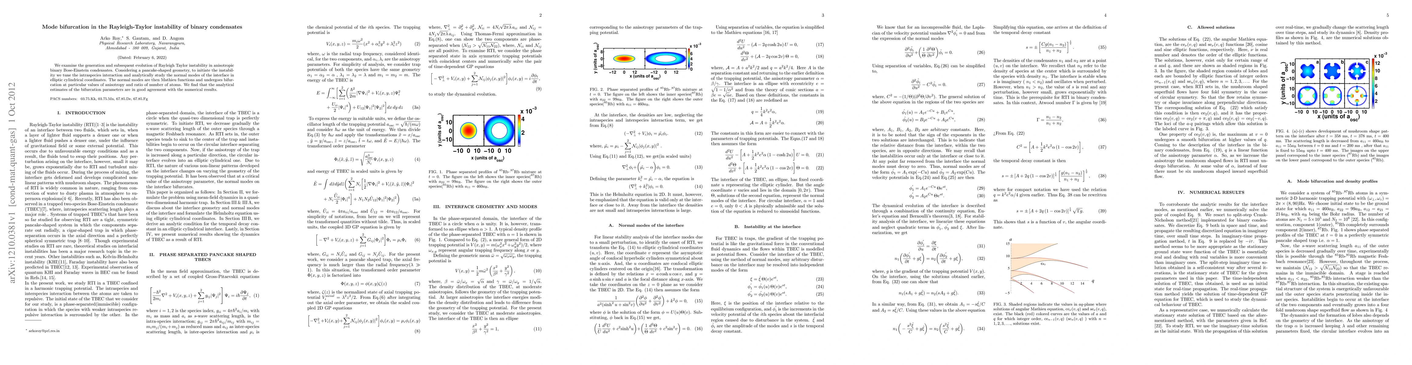 This paper investigates the Rayleigh-Taylor instability in anisotropic binary Bose-Einstein condensates, finding that normal modes of the interface are Mathieu functions. It shows mode bifurcation at specific anisotropy and atom ratio values, with analytical estimates matching numerical results.