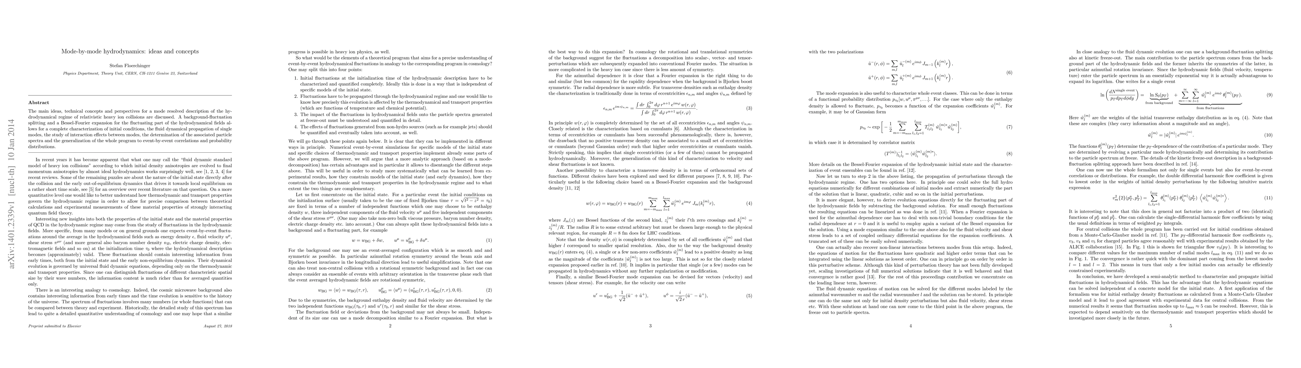 The main ideas, technical concepts and perspectives for a mode resolved description of the hydrodynamical regime of relativistic heavy ion collisions are discussed. A background-fluctuation splitting and a Bessel-Fourier expansion for the fluctuating part of the hydrodynamical fields allows for a complete characterization of initial conditions, the fluid dynamical propagation of single modes, the study of interaction effects between modes, the determination of the associated particle spectra and the generalization of the whole program to event-by-event correlations and probability distributions.