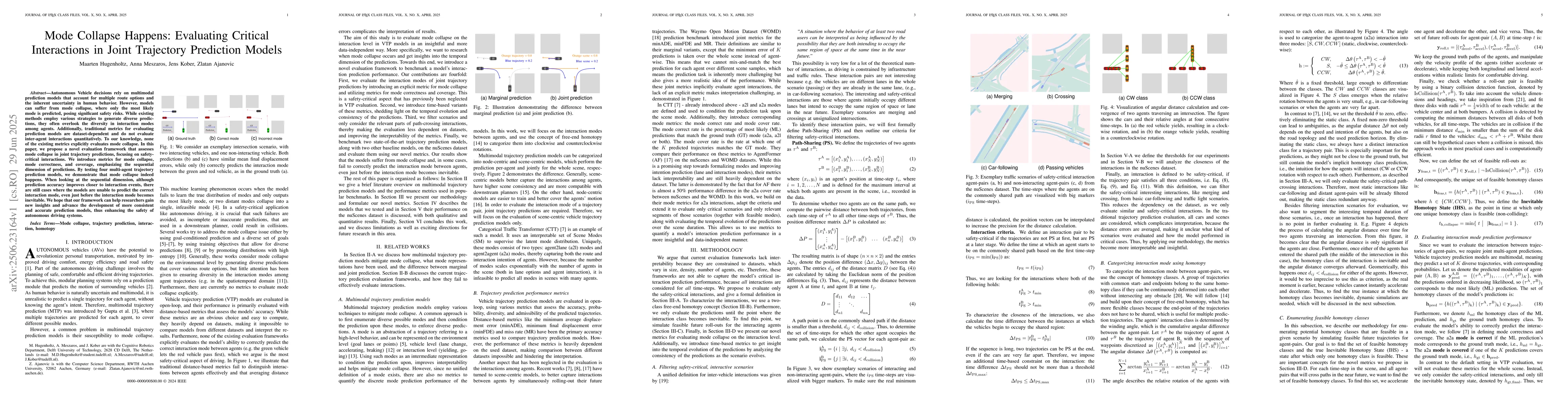Autonomous Vehicle decisions rely on multimodal prediction models that account for multiple route options and the inherent uncertainty in human behavior. However, models can suffer from mode collapse, where only the most likely mode is predicted, posing significant safety risks. While existing methods employ various strategies to generate diverse predictions, they often overlook the diversity in interaction modes among agents. Additionally, traditional metrics for evaluating prediction models are dataset-dependent and do not evaluate inter-agent interactions quantitatively. To our knowledge, none of the existing metrics explicitly evaluates mode collapse. In this paper, we propose a novel evaluation framework that assesses mode collapse in joint trajectory predictions, focusing on safety-critical interactions. We introduce metrics for mode collapse, mode correctness, and coverage, emphasizing the sequential dimension of predictions. By testing four multi-agent trajectory prediction models, we demonstrate that mode collapse indeed happens. When looking at the sequential dimension, although prediction accuracy improves closer to interaction events, there are still cases where the models are unable to predict the correct interaction mode, even just before the interaction mode becomes inevitable. We hope that our framework can help researchers gain new insights and advance the development of more consistent and accurate prediction models, thus enhancing the safety of autonomous driving systems.