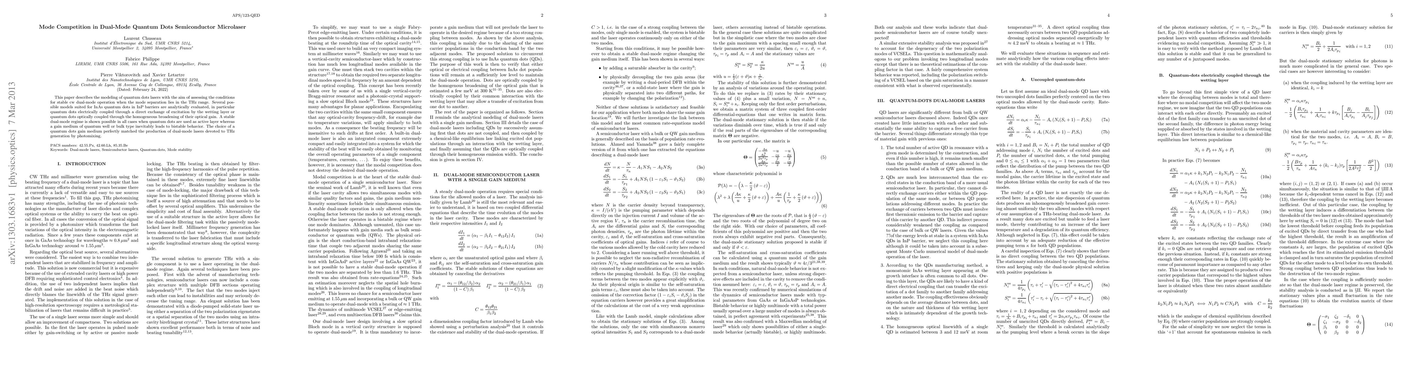 This paper describes the modeling of quantum dots lasers with the aim of assessing the conditions for stable cw dual-mode operation when the mode separation lies in the THz range. Several possible models suited for InAs quantum dots in InP barriers are analytically evaluated, in particular quantum dots electrically coupled through a direct exchange of excitation by the wetting layer or quantum dots optically coupled through the homogeneous broadening of their optical gain. A stable dual-mode regime is shown possible in all cases when quantum dots are used as active layer whereas a gain medium of quantum well or bulk type inevitably leads to bistable behavior. The choice of a quantum dots gain medium perfectly matched the production of dual-mode lasers devoted to THz generation by photomixing.