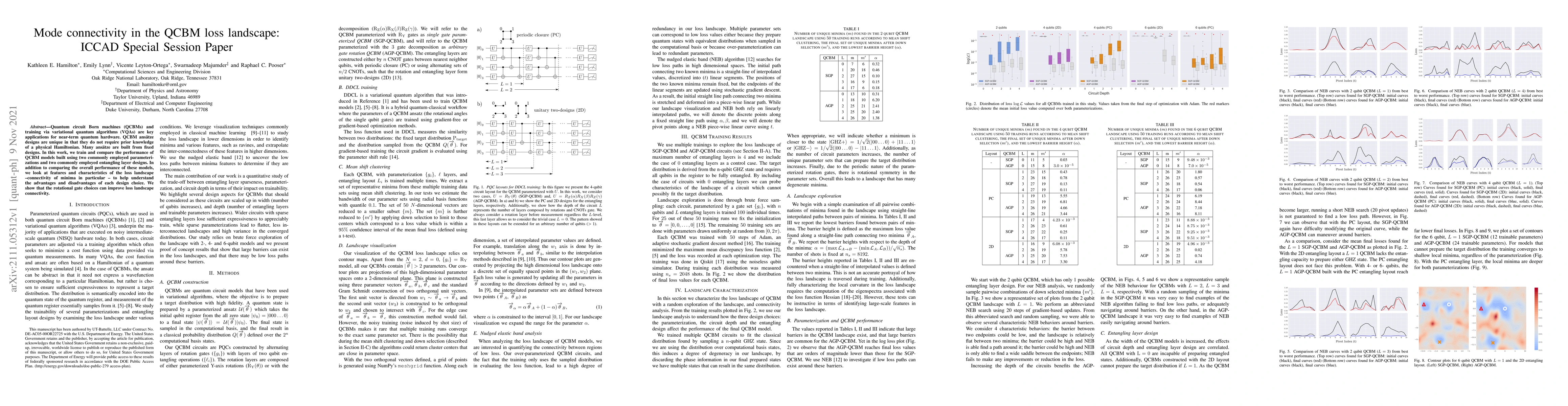 This research investigates the performance and loss landscape characteristics of two common QCBM (Quantum Circuit Born Machine) parameterizations and entangling layer designs. It reveals that specific rotational gate choices enhance loss landscape connectivity, potentially improving QCBM model training on near-term quantum hardware.