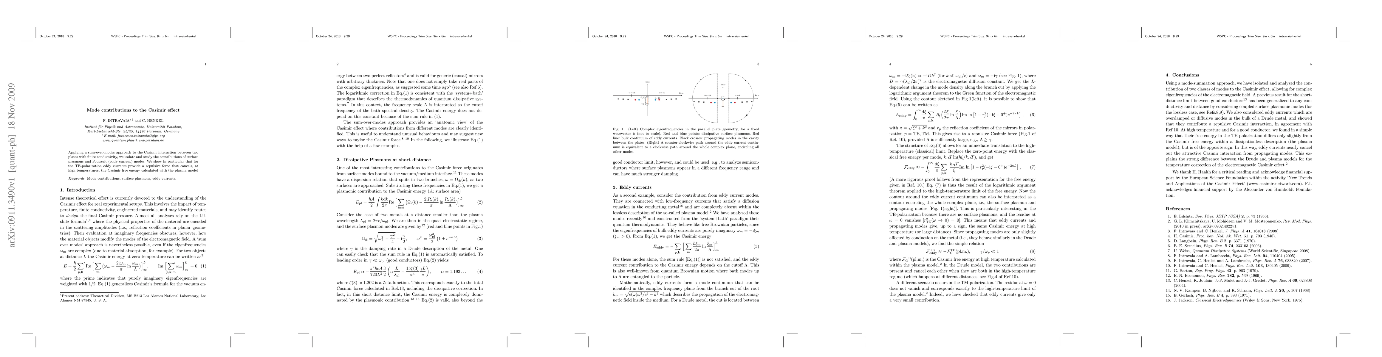 Applying a sum-over-modes approach to the Casimir interaction between two plates with finite conductivity, we isolate and study the contributions of surface plasmons and Foucault (eddy current) modes. We show in particular that for the TE-polarization eddy currents provide a repulsive force that cancels, at high temperatures, the Casimir free energy calculated with the plasma model.